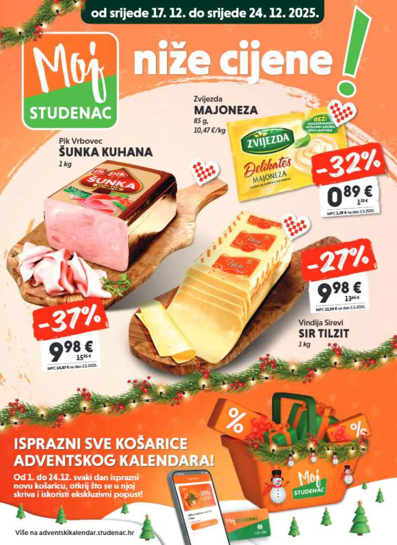 10 ponuda vrijedi od četvrtka 29. 8. 2024. do srijede 4. 9. 2024. za tanko narezano delicato dimljena šunka 90 g 18,34 €/kg 1 65 top cijena bokun gušta dimljene kračice 1 kg, vac. 5 19 super cijena pisinium istarska panceta 200 g 27,45 €/kg 5 49 super cijena pik tirolska kobasica 400 g 7,98 €/kg 3 19 super cijena cekin, vindija čajna kobasica 300 g pileća ili pureća 13,97 €/kg 4 19 super cijena perunina ptuj pileća kobasica 1 kg 2 49 super cijena planet of plants salama s proteinima suncokreta 270 g 14,78 €/kg 3 99 super cijena gavrilović sudžukica 300 g 18,30 €/kg 5 49 gavrilović mesni doručak 150 g 10,60 €/kg 1 59 gavrilović pašteta 50 g čajna ili jetrena 15,80 €/kg 0 79 super cijena perutnina ptuj hrenovke 200 g od pilećeg mesa 3,95 €/kg 0 79 super cijena wudy, aia hrenovke 1 kg 2 39 2 69