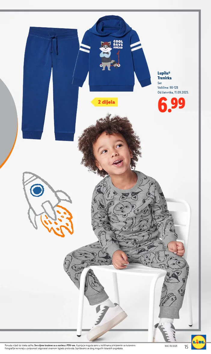 6.99 lupilu® trenirka set veličine: 98-128 od četvrtka, 11.09.2025. nac 35/2025 15 nac 35/2025 15 ponuda vrijedi do isteka zaliha. sve cijene izražene su u eurima s pdv-om. kupnja je moguća samo u količinama primjerenim za kućanstvo. fotografije ne moraju u potpunosti odgovarati stvarnom izgledu proizvoda. ispričavamo se zbog mogućih tiskarskih pogrešaka. 2 dijela