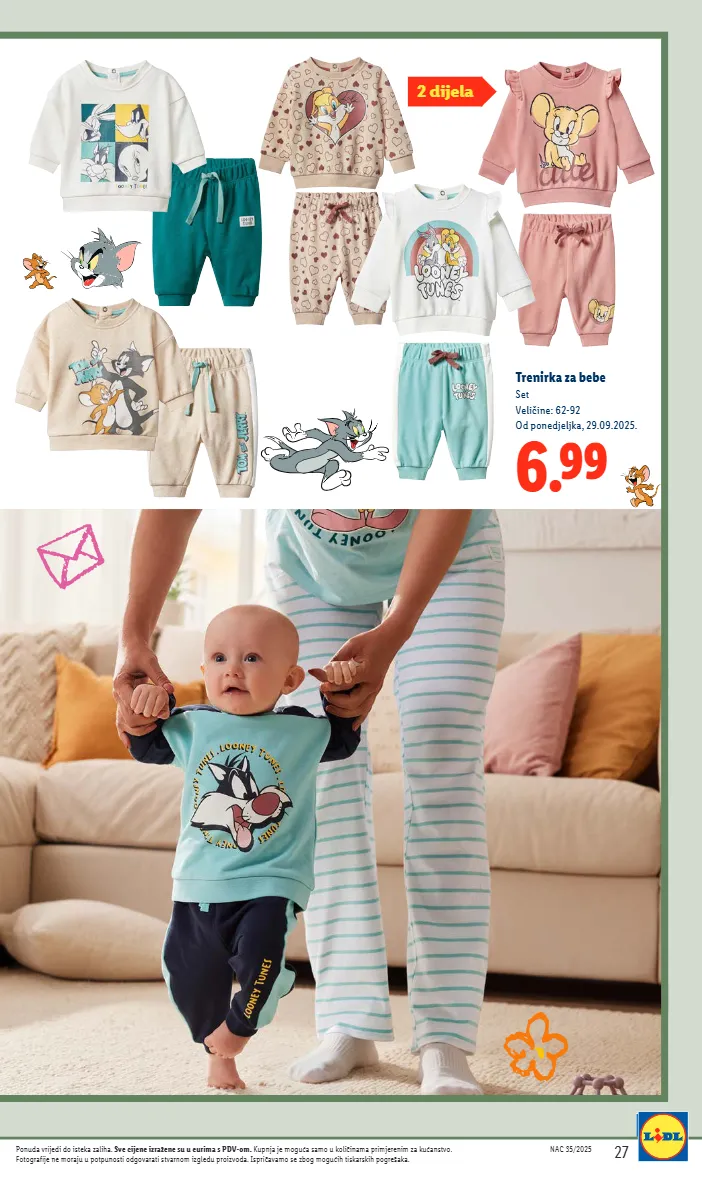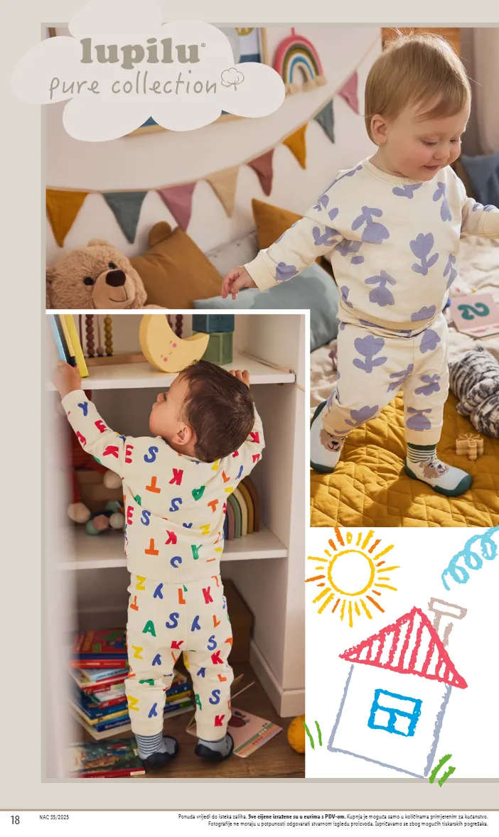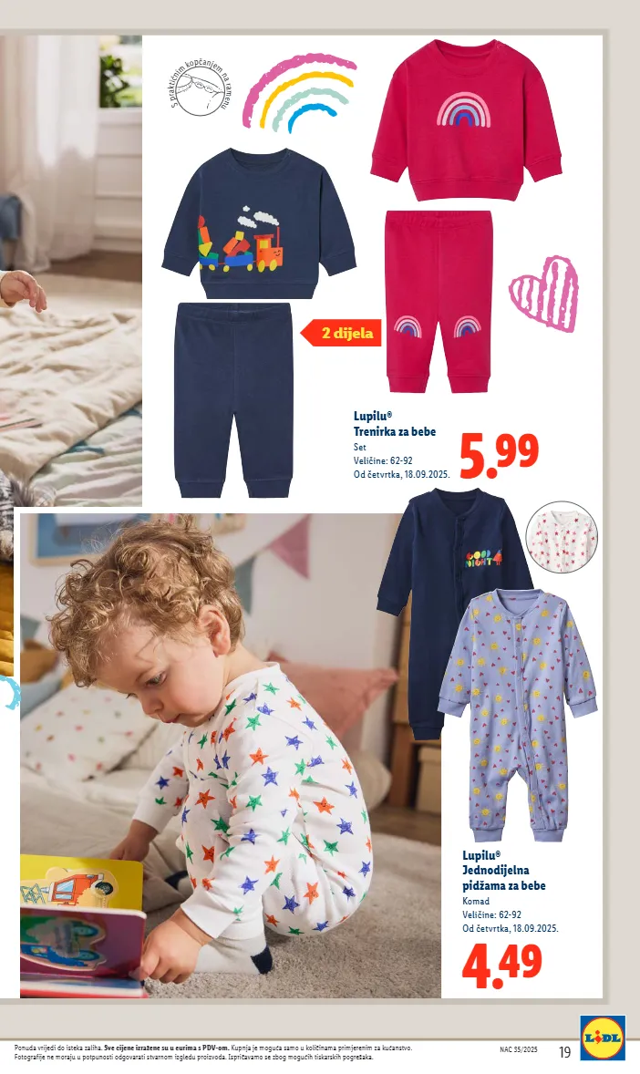 4.49 lupilu® jednodijelna pidžama za bebe komad veličine: 62-92 od četvrtka, 18.09.2025. 5.99 lupilu® trenirka za bebe set veličine: 62-92 od četvrtka, 18.09.2025. nac 35/2025 19 nac 35/2025 19 ponuda vrijedi do isteka zaliha. sve cijene izražene su u eurima s pdv-om. kupnja je moguća samo u količinama primjerenim za kućanstvo. fotografije ne moraju u potpunosti odgovarati stvarnom izgledu proizvoda. ispričavamo se zbog mogućih tiskarskih pogrešaka. s p r a k t i č n i m k o p č a n j e m n a r a m e n u 2 dijela