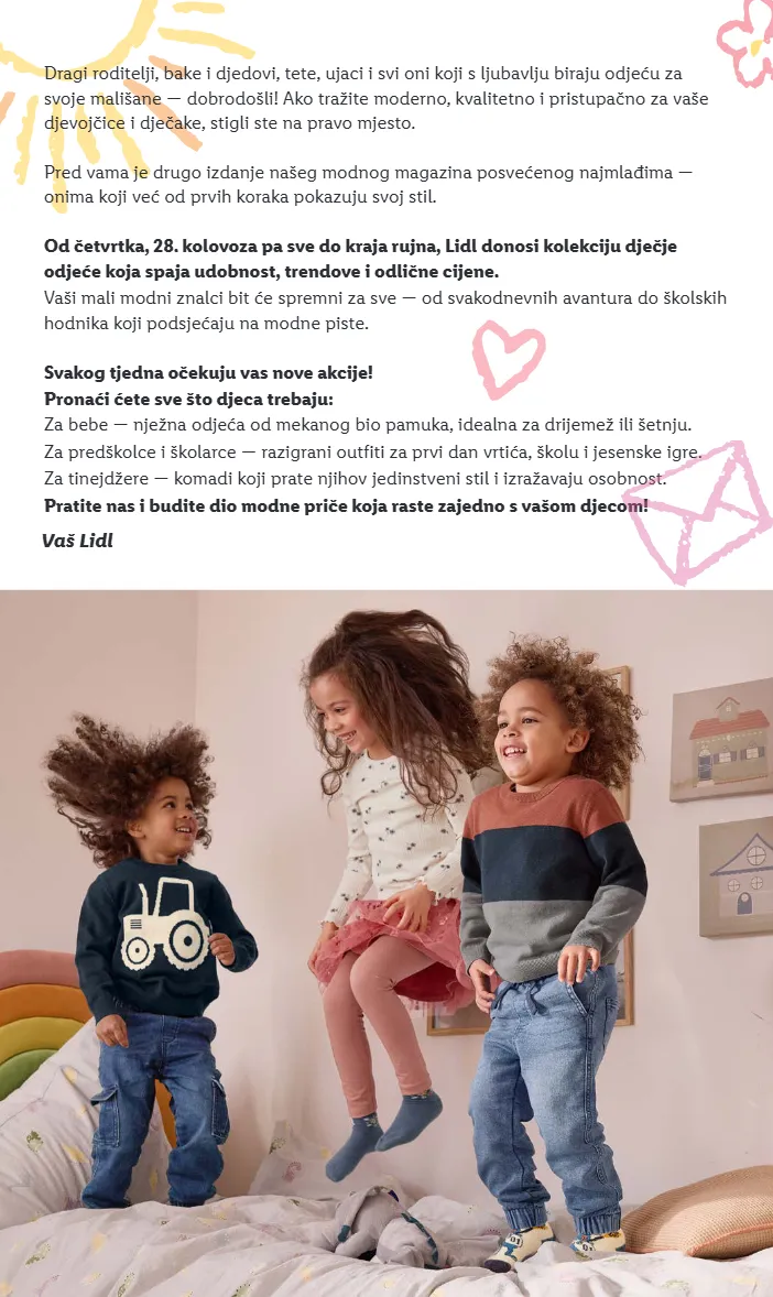 Dragi roditelji, bake i djedovi, tete, ujaci i svi oni koji s ljubavlju biraju odjeću za svoje mališane — dobrodošli! Ako tražite moderno, kvalitetno i pristupačno za vaše djevojčice i dječake, stigli ste na pravo mjesto. Pred vama je drugo izdanje našeg modnog magazina posvećenog najmlađima — onima koji već od prvih koraka pokazuju svoj stil. Od četvrtka, 28. kolovoza pa sve do kraja rujna, Lidl donosi kolekciju dječje odjeće koja spaja udobnost, trendove i odlične cijene. Vaši mali modni znalci bit će spremni za sve — od svakodnevnih avantura do školskih hodnika koji podsjećaju na modne piste. Svakog tjedna očekuju vas nove akcije! Pronaći ćete sve što djeca trebaju: Za bebe — nježna odjeća od mekanog bio pamuka, idealna za drijemež ili šetnju. Za predškolce i školarce — razigrani outfiti za prvi dan vrtića, školu i jesenske igre. Za tinejdžere — komadi koji prate njihov jedinstveni stil i izražavaju osobnost. Pratite nas i budite dio modne priče koja raste zajedno s vašom djecom! Vaš Lidl