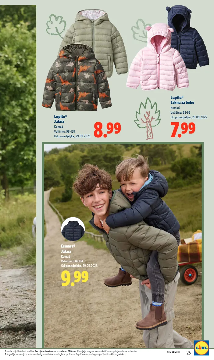 8.99 lupilu® jakna komad veličine: 98-128 od ponedjeljka, 29.09.2025. 7.99 lupilu® jakna za bebe komad veličine: 62-92 od ponedjeljka, 29.09.2025. 9.99 esmara® jakna komad veličine: 134-164 od ponedjeljka, 29.09.2025. nac 35/2025 25 ponuda vrijedi do isteka zaliha. sve cijene izražene su u eurima s pdv-om. kupnja je moguća samo u količinama primjerenim za kućanstvo. fotografije ne moraju u potpunosti odgovarati stvarnom izgledu proizvoda. ispričavamo se zbog mogućih tiskarskih pogrešaka.