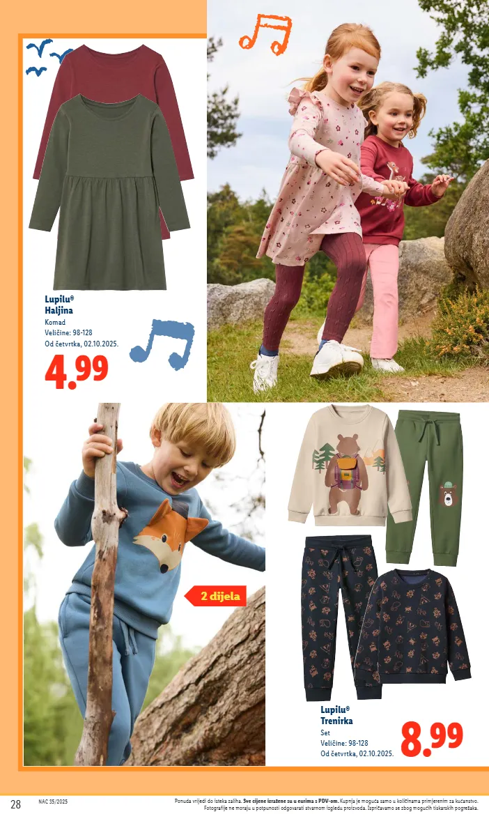 8.99 lupilu® trenirka set veličine: 98-128 od četvrtka, 02.10.2025. 4.99 lupilu® haljina komad veličine: 98-128 od četvrtka, 02.10.2025. 2 dijela 28 nac 35/2025 ponuda vrijedi do isteka zaliha. sve cijene izražene su u eurima s pdv-om. kupnja je moguća samo u količinama primjerenim za kućanstvo. fotografije ne moraju u potpunosti odgovarati stvarnom izgledu proizvoda. ispričavamo se zbog mogućih tiskarskih pogrešaka.