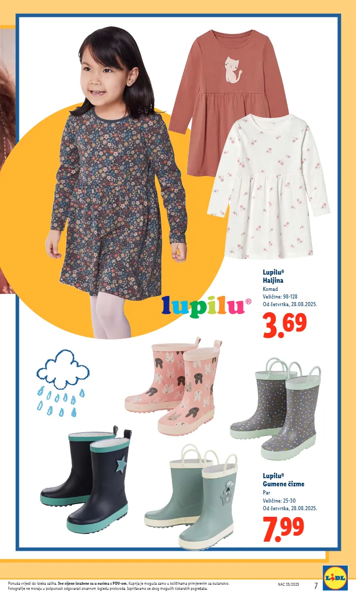 nac 35/2025 7 ponuda vrijedi do isteka zaliha. sve cijene izražene su u eurima s pdv-om. kupnja je moguća samo u količinama primjerenim za kućanstvo. fotografije ne moraju u potpunosti odgovarati stvarnom izgledu proizvoda. ispričavamo se zbog mogućih tiskarskih pogrešaka. 7.99 lupilu® gumene čizme par veličine: 25-30 od četvrtka, 28.08.2025. 3.69 lupilu® haljina komad veličine: 98-128 od četvrtka, 28.08.2025.