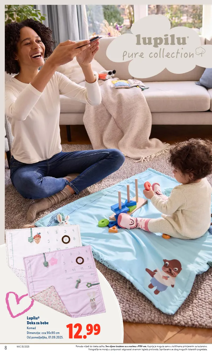 8 nac 35/2025 8 nac 35/2025 ponuda vrijedi do isteka zaliha. sve cijene izražene su u eurima s pdv-om. kupnja je moguća samo u količinama primjerenim za kućanstvo. fotografije ne moraju u potpunosti odgovarati stvarnom izgledu proizvoda. ispričavamo se zbog mogućih tiskarskih pogrešaka. 12.99 lupilu® deka za bebe komad dimenzije: cca 90x90 cm od ponedjeljka, 01.09.2025.