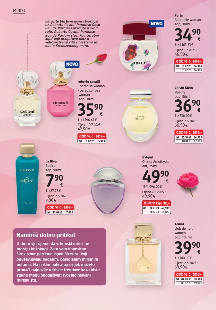Furla Adorabile woman edp, 30 ml 34 90 € 1 l / 1.163,33 € Cijena 1.7.2025.: 46,90 € od 31.07.25 34,90 € 01.07.25 46,90 € roberto cavalli - paradiso woman - paradiso rosa woman edp, 30 ml 35 90 € 1 l / 1.196,67 € Cijena 10.7.2025.: 47,90 € od 31.07.25 35,90 € Bvlgari Omnia Amethyste edt, 25 ml 49 90 € 1 l / 1.996,00 € Cijena 2.5.2025.: 49,90 € od 30.03.23 49,90 € 11.02.23 60,00 € Calvin Klein Beauty edp, 50 ml 36 90 € 1 l / 738,00 € Cijena 2.5.2025.: 36,90 € od 05.10.23 36,90 € 01.01.23 42,46 € Armaf club de nuit women edp, 105 ml 39 90 € 1 l / 380,00 € Cijena 2.5.2025.: 39,90 € od 09.03.23 39,90 € 08.02.23 59,90 € La Rive Saffira edp, 90 ml 7 90 € 1 l / 87,78 € Cijena 2.5.2025.: 7,90 € od 14.01.25 7,90 € NOVO NOVO Namiriši dobru priliku! U dm-u vjerujemo da vrhunski mirisi ne moraju biti skupi. Zato vam donosimo širok izbor parfema ispod 50 eura, koji oduševljavaju bogatim, postojanim mirisnim notama. Na našim policama uvijek možete pronaći najnovije mirisne trendove kako biste stalno mogli obogaćivati svoj jedinstveni mirisni stil. Istražite blistavu novu stvarnost uz Roberto Cavalli Paradiso Rosa Eau de Parfum i uživajte u svom raju. Roberto Cavalli Paradiso Eau de Parfum služi kao čarobni ključ koji otključava ulaz u veličanstvenu vilu smještenu uz obalu Sredozemnog mora. MIRISI