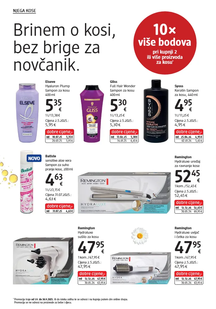 elseve hyaluron plump šampon za kosu 400 ml 5 35 € 1 l / 13,38 € cijena 2.5.2025.: 5,95 € od 10.07.25 5,35 € 20.03.25 5,95 € gliss full hair wonder šampon za kosu 400 ml 5 30 € 1 l / 13,25 € cijena 2.5.2025.: 5,30 € od 13.02.25 5,30 € 14.01.25 6,45 € syoss keratin šampon za kosu, 440 ml 4 95 € 1 l / 11,25 € cijena 2.5.2025.: 4,95 € od 25.04.24 4,95 € 02.01.24 5,45 € remington hydraluxe sušilo za kosu 47 95 € 1 kom. / 47,95 € cijena 2.5.2025.: 47,95 € od 12.12.24 47,95 € 30.05.24 63,95 € batiste sensitive aloe vera šampon za suho pranje kose, 200 ml 4 63 € 1 l / 23,15 € cijena 31.07.2025.: 4,63 € od 31.07.25 4,63 € remington hydraluxe uređaj za ravnanje kose 52 45 € 1 kom. / 52,45 € cijena 2.5.2025.: 52,45 € od 12.12.24 52,45 € 30.05.24 69,95 € remington hydraluxe uvijač i četka za kosu 47 95 € 1 kom. / 47,95 € cijena 2.5.2025.: 47,95 € od 12.12.24 47,95 € 30.05.24 63,95 € novo brinem o kosi, bez brige za novčanik. 10 × više bodova pri kupnji 2 ili više proizvoda za kosu * * promocija traje od 1.9. do 30.9.2025. ili do isteka zaliha te se odnosi i na kupnju putem dm online shopa. promocija se ne odnosi na proizvode za bebe i djecu. njega kose njega kose