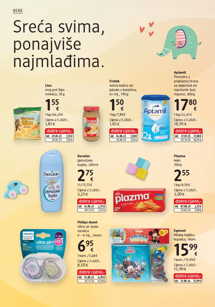 egmont mickey knjižica kupalica, 1 kom. 15 99 € 1 kom. / 15,99 € cijena 2.5.2025.: 15,99 € od 13.09.24 15,99 € aptamil pronutra 2 prijelazna hrana za dojenčad od navršenih šest mjeseci, 800 g 17 80 € 1 kg / 22,25 € cijena 2.5.2025.: 18,95 € od 17.07.25 17,80 € 03.10.24 18,95 € frutek voćna kašica od jabuke s kolačima, 6+ mj., 190 g 1 50 € 1 kg / 7,89 € cijena 2.5.2025.: 1,65 € od 14.08.25 1,50 € 01.08.24 1,65 € lino moj prvi flips mrkvica, 35 g 1 55 € 1 kg / 44,29 € cijena 2.5.2025.: 1,85 € od 29.05.25 1,55 € 01.05.25 1,85 € plazma keks 300 g 2 55 1 kg / 8,50 € cijena 2.5.2025.: 3,00 € od 07.08.25 2,55 € 23.05.24 3,00 € becutan pjenušava kupka, 200 ml 2 75 € 1 l / 13,75 € cijena 2.5.2025.: 3,25 € od 14.08.25 2,75 € 09.11.23 3,25 € philips avent ultra air duda varalica 0 – 6 mj., 2 kom. 6 95 € 1 kom. / 3,48 € cijena 2.5.2025.: 8,50 € od 14.08.25 6,95 € 07.11.24 8,50 € sreća svima, ponajviše najmlađima. bebe