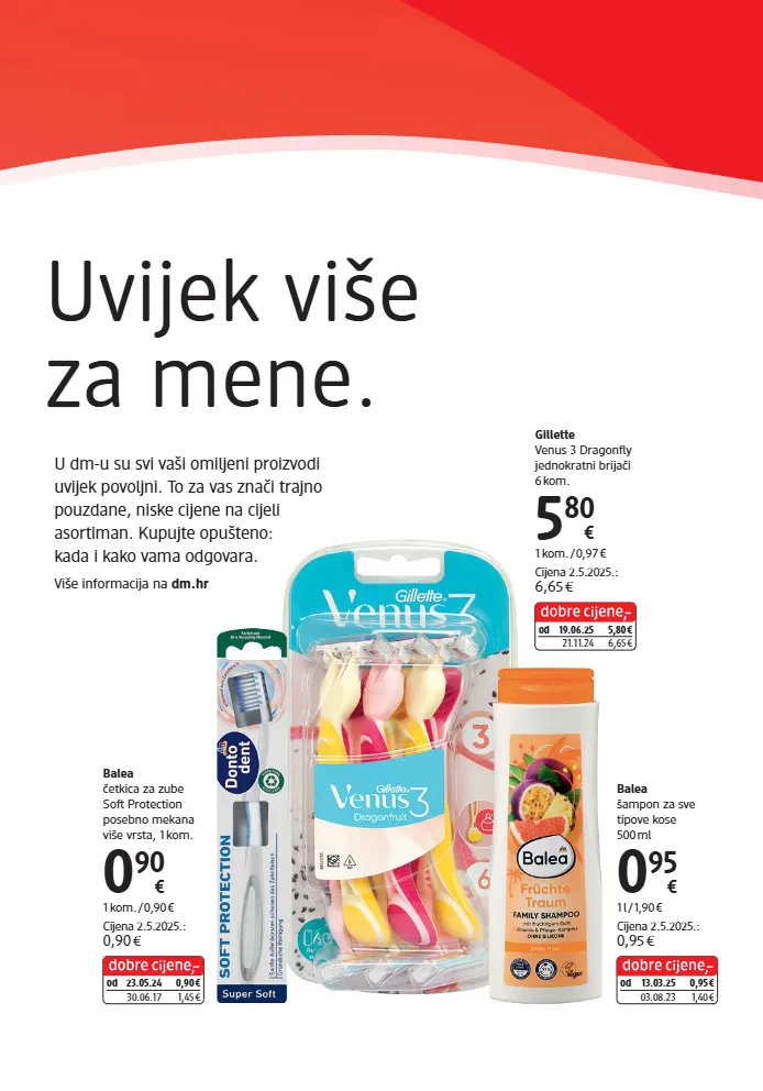 Balea četkica za zube Soft Protection posebno mekana više vrsta, 1 kom. 0 90 € 1 kom. / 0,90 € Cijena 2.5.2025.: 0,90 € od 23.05.24 0,90 € 30.06.17 1,45 € Gillette Venus 3 Dragonfly jednokratni brijači 6 kom. 5 80 € 1 kom. / 0,97 € Cijena 2.5.2025.: 6,65 € od 19.06.25 5,80 € 21.11.24 6,65 € Balea šampon za sve tipove kose 500 ml 0 95 € 1 l / 1,90 € Cijena 2.5.2025.: 0,95 € od 13.03.25 0,95 € 03.08.23 1,40 € Uvijek više za mene. U dm-u su svi vaši omiljeni proizvodi uvijek povoljni. To za vas znači trajno pouzdane, niske cijene na cijeli asortiman. Kupujte opušteno: kada i kako vama odgovara. Više informacija na dm.hr