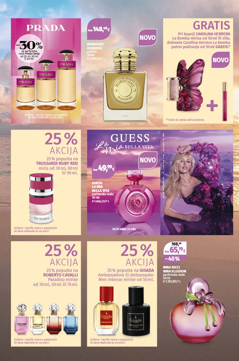 kom 65, 19 € − 40 % 108, 69 kom 148, 49 € snižene i najniže cijene u posljednjih 30 dana istaknute su na polici. *vrijedi do isteka zaliha poklona. nina ricci nina illusion parfemska voda 50 ml € 1.303,80 / 1 l snižene i najniže cijene u posljednjih 30 dana istaknute su na polici. snižene i najniže cijene u posljednjih 30 dana istaknute su na polici. burberry goddess parfem 50 ml € 2.969,80 / 1 l gratis pri kupnji carolina herrera la bomba mirisa od 50 ml ili više, dobivate carolina herrera la bomba putno pakiranje od 10 ml gratis .* 25 % akcija 25 % popusta na roberto cavalli paradiso mirise od 30 ml, 50 ml ili 75 ml. 25 % akcija 25 % popusta na trussardi ruby red miris od 30 ml, 60 ml ili 90 ml. 25 % akcija 25 % popusta na gisada ambassadora ili ambassador men intense mirise od 50 ml. novi miris za nju kom 49, 99 € guess la mia bella vita parfemska voda 30 ml € 1.666,33/1 l novo snižene i najniže cijene u posljednjih 30 dana istaknute su na polici. -30 na parfemske vode prada candy od 30 ml, 50 ml ili 80 ml. novo novo