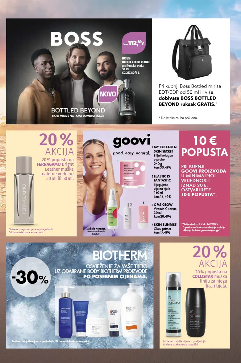 snižene i najniže cijene u posljednjih 30 dana istaknute su na polici. 30 osvježenje za vaše tijelo uz odabrane body biotherm proizvode po posebnim cđenama. snižene i najniže cijene u posljednjih 30 dana istaknute su na polici. snižene i najniže cijene u posljednjih 30 dana istaknute su na polici. 20 % akcija 20 % popusta na collistar mušku liniju za njegu lica i tijela. 20 % akcija 20 % popusta na ferragamo bright leather muške toaletne vode od 30 ml ili 50 ml. michelle hunziker, osnivačica brenda goovi 2 1 4 3 1 2 3 4 kom 16,49 € my collagen skin secret biljni kolagen u prahu 240 g elastic is fantastic njegujuće ulje za tijelo 140 ml c me glow vitamin c serum 30 ml skin sunrise glow primer kom 17,49 € kom 30,49 € kom 28,49 € 10 € popusta pri kupnji goovi proizvoda u minimalnoj vrijednosti iznad 30 €, ostvarujete 10 € popusta* . *akcija vrijedi od 1.9. do 14.9.2025. popusti se međusobno ne zbrajaju, a akcije isključuju. isplata u gotovini nije moguća. bottled beyond novi miris s notama ðumbira i kože kom 112, 89 € boss bottled beyond parfemska voda 50 ml € 2.257,80/1 l novo