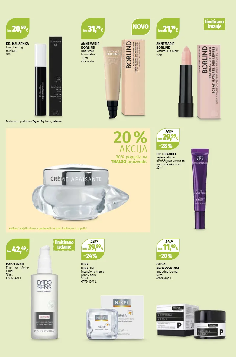 kom 21, 19 € kom 20, 59 € kom 39, 99 € − 24 % 52, 98 kom 31, 79 € kom 42, 49 € kom 29, 99 € − 28 % 41, 69 kom 11, 49 € − 20 % 14, 49 annemarie börlind natural lip glow 4,2 g snižene i najniže cijene u posljednjih 30 dana istaknute su na polici. nikel nikelift intenzivna krema protiv bora 50 ml € 799,80 / 1 l annemarie börlind natuwear foundation 30 ml više vrsta dado sens ectoin anti-aging fluid 75 ml € 566,54/ 1 l dostupno u poslovnici zagreb trg bana j.jelačiča. dr. grandel regenerativna učvršćujuća krema za područje oko očiju 20 ml olival professional peptidna krema 50 ml € 229,80 / 1 l dr. hauschka long lasting maskara 8 ml 20 % akcija 20 % popusta na thalgo proizvode. limitirano izdanje novo limitirano izdanje