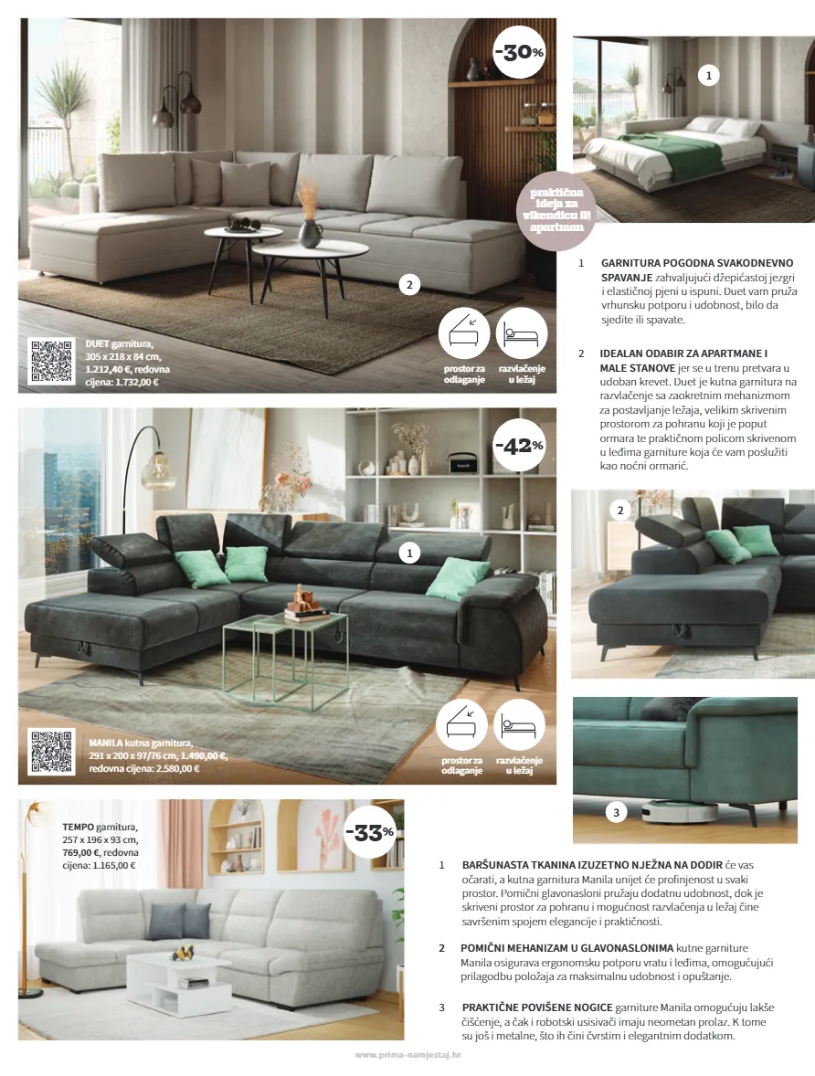 www.prima-namjestaj.hr baršunasta tkanina izuzetno nježna na dodir će vas očarati, a kutna garnitura manila unijet će profinjenost u svaki prostor. pomični glavonasloni pružaju dodatnu udobnost, dok je skriveni prostor za pohranu i mogućnost razvlačenja u ležaj čine savršenim spojem elegancije i praktičnosti. pomični mehanizam u glavonaslonima kutne garniture manila osigurava ergonomsku potporu vratu i leđima, omogućujući prilagodbu položaja za maksimalnu udobnost i opuštanje. praktične povišene nogice garniture manila omogućuju lakše čišćenje, a čak i robotski usisivači imaju neometan prolaz. k tome su još i metalne, što ih čini čvrstim i elegantnim dodatkom. 1 2 3 2 1 1 3 2 idealan odabir za apartmane i male stanove jer se u trenu pretvara u udoban krevet. duet je kutna garnitura na razvlačenje sa zaokretnim mehanizmom za postavljanje ležaja, velikim skrivenim prostorom za pohranu koji je poput ormara te praktičnom policom skrivenom u leđima garniture koja će vam poslužiti kao noćni ormarić. garnitura pogodna svakodnevno spavanje zahvaljujući džepićastoj jezgri i elastičnoj pjeni u ispuni. duet vam pruža vrhunsku potporu i udobnost, bilo da sjedite ili spavate. 1 2 2 tempo garnitura, 257 x 196 x 93 cm, 769,00 € , redovna cijena: 1.165,00 € manila kutna garnitura, 291 x 200 x 97/76 cm, 1.490,00 € , redovna cijena: 2.580,00 € razvlačenje u ležaj prostor za odlaganje razvlačenje u ležaj prostor za odlaganje praktična ideja za vikendicu ili apartman - 33 % - 42 % - 30 % duet garnitura, 305 x 218 x 84 cm, 1.212,40 € , redovna cijena: 1.732,00 €