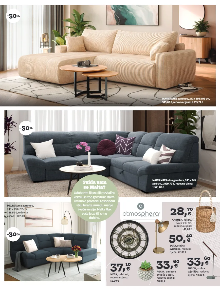 28, 70 € carmen , košara, š22 x v43 cm, redovna cijena: 41,00 € 33, 60 € anton, stolna svjetiljka, redovna cijena: 48,00 € 50, 40 € bota, stolna svjetiljka, redovna cijena: 72,00 € 37, 10 € meca, zidni sat, redovna cijena: 53,00 € 33, 60 € agava, umjetno cvijeće u tegli , redovna cijena: 48,00 € maris kutna garnitura, 273 x 194 x 93 cm, 949,00 € , redovna cijena: 1.355,71 € malta max kutna garnitura, 245 x 245 x 92 cm, 1.099,70 € , redovna cijena: 1.571,00 € malta kutna garnitura, 245 x 180 x 92 cm, 759,50 € , redovna cijena: 1.085,00 € sviđa vam se malta? odaberite fiksnu ili razvlačnu verziju kutne garniture malta. ovisno o prostoru i osobnom stilu birajte između manje i veće verzije. malta max veća je za 65 cm u dubinu. - 30 % - 30 % - 30 %
