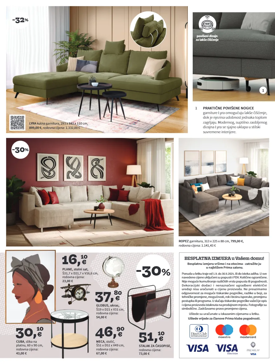 30, 10 € cuba , slika na platnu, 60 x 90 cm, redovna cijena: 43,00 € 46, 90 € meca , stolić, š51 x d51 x v49 cm, redovna cijena: 67,00 € 37, 80 € globus, ukras, š19 x d21 x v31 cm, redovna cijena: 54,00 € 16, 10 € plane, stolni sat, š31,7 x d21,7 x v16,6 cm, redovna cijena: 23,00 € 51, 10 € stalak za časopise, redovna cijena: 73,00 € - 30 % uštede su uračunate u iskazanim cijenama u letku. uštede vrijede za članove prima kluba pogodnosti. 1 praktične povišene nogice garniture lyra omogućuju lakše čišćenje, dok je njezina udobnost jednaka toplom zagrljaju. modernog, suptilno zaobljenog dizajna lyra se sjajno uklapa u stilski suvremene interijere. 1 ropez garnitura, 313 x 225 x 88 cm, 799,00 € , redovna cijena: 1.141,43 € povišeni dizajn za lakše čišćenje lyra kutna garnitura, 293 x 183 x 110 cm, 899,00 € , redovna cijena: 1.332,00 € - 32 % - 30 % besplatna izmjera u vašem domu! besplatnu izmjeru vršimo i na otocima - zatražite ju u najbližem prima salonu. ponuda u letku traje od 1.9. do 30.9.2025 . ili do isteka zaliha. u sve navedene cijene uključeni su popusti i pdv. količine ograničene. nije moguće kumuliranje različitih vrsta popusta ili pogodnosti. dekoracijski dodaci i nenaznačeni ugradbeni električni uređaji nisu uračunati u cijenu proizvoda. ne preuzimamo odgovornost za moguće tiskarske pogreške, razlike u boji, za tehničke promjene, mogućnosti, rok i brzinu isporuke, promjenu postupka ili programa. u slučaju tiskarske pogreške važeći je opis i cijena proizvoda istaknuta na prodajnom mjestu. fotografije su simbolične. zadržavamo pravo promjene cijena.