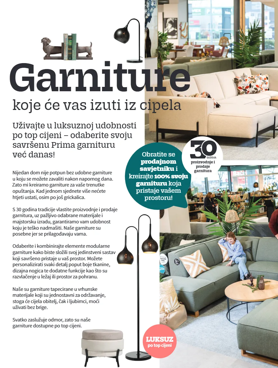 Uživajte u luksuznoj udobnosti po top cijeni – odaberite svoju savršenu Prima garnituru već danas! Garniture Obratite se prodajnom savjetniku i kreirajte 100% svoju garnituru koja pristaje vašem prostoru! Nijedan dom nije potpun bez udobne garniture u koju se možete zavaliti nakon napornog dana. Zato mi kreiramo garniture za vaše trenutke opuštanja. Kad jednom sjednete više nećete htjeti ustati, osim po još grickalica. S 30 godina tradicije vlastite proizvodnje i prodaje garnitura, uz pažljivo odabrane materijale i majstorsku izradu, garantiramo vam udobnost koju je teško nadmašiti. Naše garniture su posebne jer se prilagođavaju vama. Odaberite i kombinirajte elemente modularne garniture kako biste složili svoj jedinstveni sastav koji savršeno pristaje u vaš prostor. Možete personalizirati svaki detalj poput boje tkanine, dizajna nogica te dodatne funkcije kao što su razvlačenje u ležaj ili prostor za pohranu. Naše su garniture tapecirane u vrhunske materijale koji su jednostavni za održavanje, stoga će cijela obitelj, čak i ljubimci, moći uživati bez brige. Svatko zaslužuje odmor, zato su naše garniture dostupne po top cijeni. koje će vas izuti iz cipela proizvodnje i prodaje garnitura LUKSUZ po top cijeni