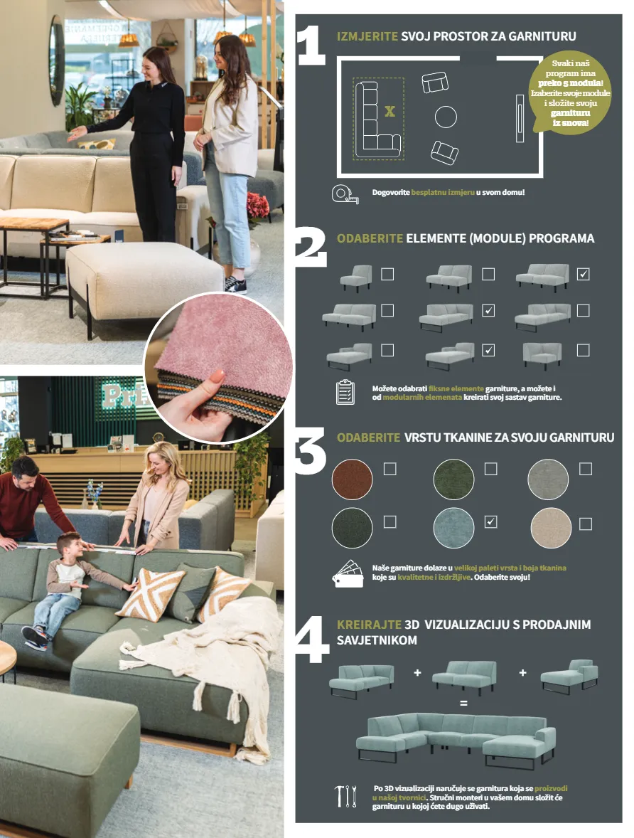 IZMJERITE SVOJ PROSTOR ZA GARNITURU 1 Dogovorite besplatnu izmjeru u svom domu! X ODABERITE ELEMENTE (MODULE) PROGRAMA 2 Možete odabrati fiksne elemente garniture, a možete i od modularnih elemenata kreirati svoj sastav garniture. KREIRAJTE 3D VIZUALIZACIJU S PRODAJNIM SAVJETNIKOM ODABERITE VRSTU TKANINE ZA SVOJU GARNITURU 4 3 Naše garniture dolaze u velikoj paleti vrsta i boja tkanina koje su kvalitetne i izdržljive . Odaberite svoju! + + = Po 3D vizualizaciji naručuje se garnitura koja se proizvodi u našoj tvornici . Stručni monteri u vašem domu složit će garnituru u kojoj ćete dugo uživati. Svaki naš program ima preko 5 modula ! Izaberite svoje module i složite svoju garnituru iz snova !