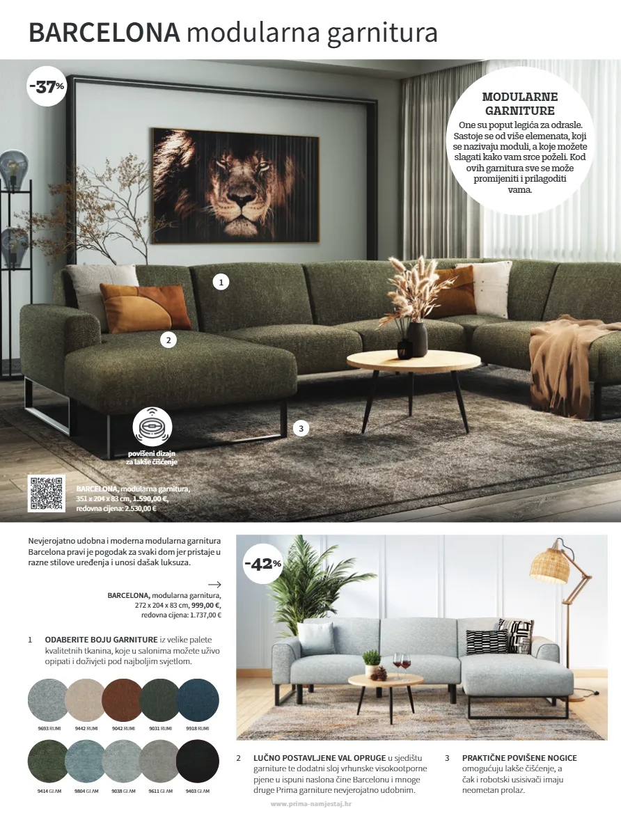 www.prima-namjestaj.hr 1 2 3 ODABERITE BOJU GARNITURE iz velike palete kvalitetnih tkanina, koje u salonima možete uživo opipati i doživjeti pod najboljim svjetlom. 1 LUČNO POSTAVLJENE VAL OPRUGE u sjedištu garniture te dodatni sloj vrhunske visokootporne pjene u ispuni naslona čine Barcelonu i mnoge druge Prima garniture nevjerojatno udobnim. 2 PRAKTIČNE POVIŠENE NOGICE omogućuju lakše čišćenje, a čak i robotski usisivači imaju neometan prolaz. 3 9693 RUMI 9442 RUMI 9042 RUMI 9031 RUMI 9918 RUMI 9414 GLAM 9804 GLAM 9038 GLAM 9611 GLAM 9403 GLAM povišeni dizajn za lakše čišćenje MODULARNE GARNITURE One su poput legića za odrasle. Sastoje se od više elemenata, koji se nazivaju moduli, a koje možete slagati kako vam srce poželi. Kod ovih garnitura sve se može promijeniti i prilagoditi vama. BARCELONA modularna garnitura Nevjerojatno udobna i moderna modularna garnitura Barcelona pravi je pogodak za svaki dom jer pristaje u razne stilove uređenja i unosi dašak luksuza. BARCELONA, modularna garnitura , 272 x 204 x 83 cm, 999,00 € , redovna cijena: 1.737,00 € BARCELONA, modularna garnitura , 351 x 204 x 83 cm, 1.590,00 € , redovna cijena: 2.530,00 € - 42 % - 37 %