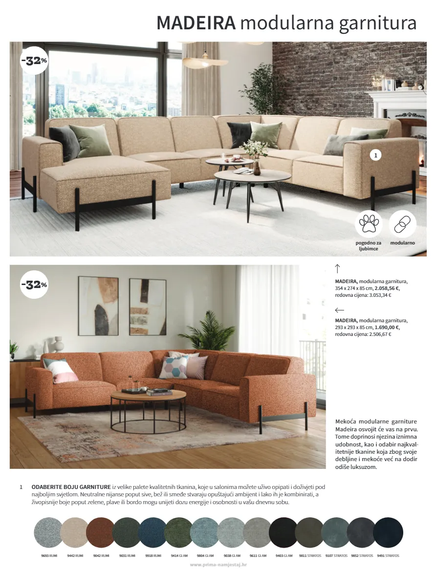www.prima-namjestaj.hr 1 modularno 9693 RUMI 9442 RUMI 9042 RUMI 9031 RUMI 9918 RUMI 9414 GLAM 9804 GLAM 9038 GLAM 9611 GLAM 9403 GLAM 9811 STRATOS 9107 STRATOS 9852 STRATOS 9491 STRATOS ODABERITE BOJU GARNITURE iz velike palete kvalitetnih tkanina, koje u salonima možete uživo opipati i doživjeti pod najboljim svjetlom. Neutralne nijanse poput sive, bež ili smeđe stvaraju opuštajući ambijent i lako ih je kombinirati, a živopisnije boje poput zelene, plave ili bordo mogu unijeti dozu energije i osobnosti u vašu dnevnu sobu. 1 pogodno za ljubimce MADEIRA modularna garnitura MADEIRA, modularna garnitura , 354 x 274 x 85 cm, 2.058,56 € , redovna cijena: 3.053,34 € MADEIRA, modularna garnitura , 293 x 293 x 85 cm, 1.690,00 € , redovna cijena: 2.506,67 € - 32 % - 32 % Mekoća modularne garniture Madeira osvojit će vas na prvu. Tome doprinosi njezina iznimna udobnost, kao i odabir najkval - itetnije tkanine koja zbog svoje debljine i mekoće već na dodir odiše luksuzom.