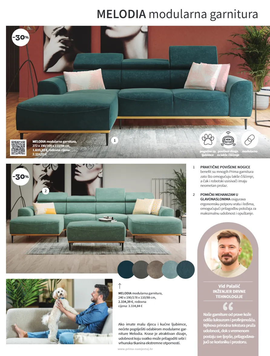 www.prima-namjestaj.hr POMIČNI MEHANIZAM U GLAVONASLONIMA osigurava ergonomsku potporu vratu i leđima, omogućujući prilagodbu položaja za maksimalnu udobnost i opuštanje. 2 PRAKTIČNE POVIŠENE NOGICE benefit su mnogih Prima garnitura zato što omogućuju lakše čišćenje, a čak i robotski usisivači imaju neometan prolaz. 1 2 1 modularno povišeni dizajn za lakše čišćenje Naše garniture od prave kože odišu luksuzom i profinjenošću. Njihova prirodna tekstura pruža udobnost, dok s vremenom postaju sve ljepše, prilagođava - jući se korisniku i prostoru. “ Vid Palalić INŽENJER DRVNE TEHNOLOGIJE pogodno za ljubimce MELODIA modularna garnitura, 240 x 190/178 x 110/88 cm, 2.334,39 € , redovna cijena: 3.334,84 € MELODIA modularna garnitura, 272 x 190/109 x 110/88 cm, 1.633,33 € , redovna cijena: 2.333,33 € Ako imate malu djecu i kućne ljubimce, nećete pogriješiti odabirom modularne gar - niture Melodia. Krase je atraktivan dizajn, udobnost koju svatko može prilagoditi sebi i vrhunska tkanina ekstremne otpornosti. - 30 % - 30 % MELODIA modularna garnitura