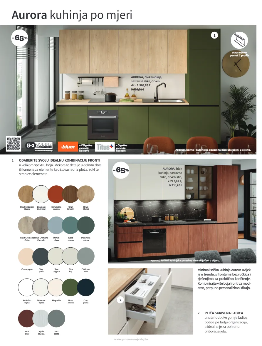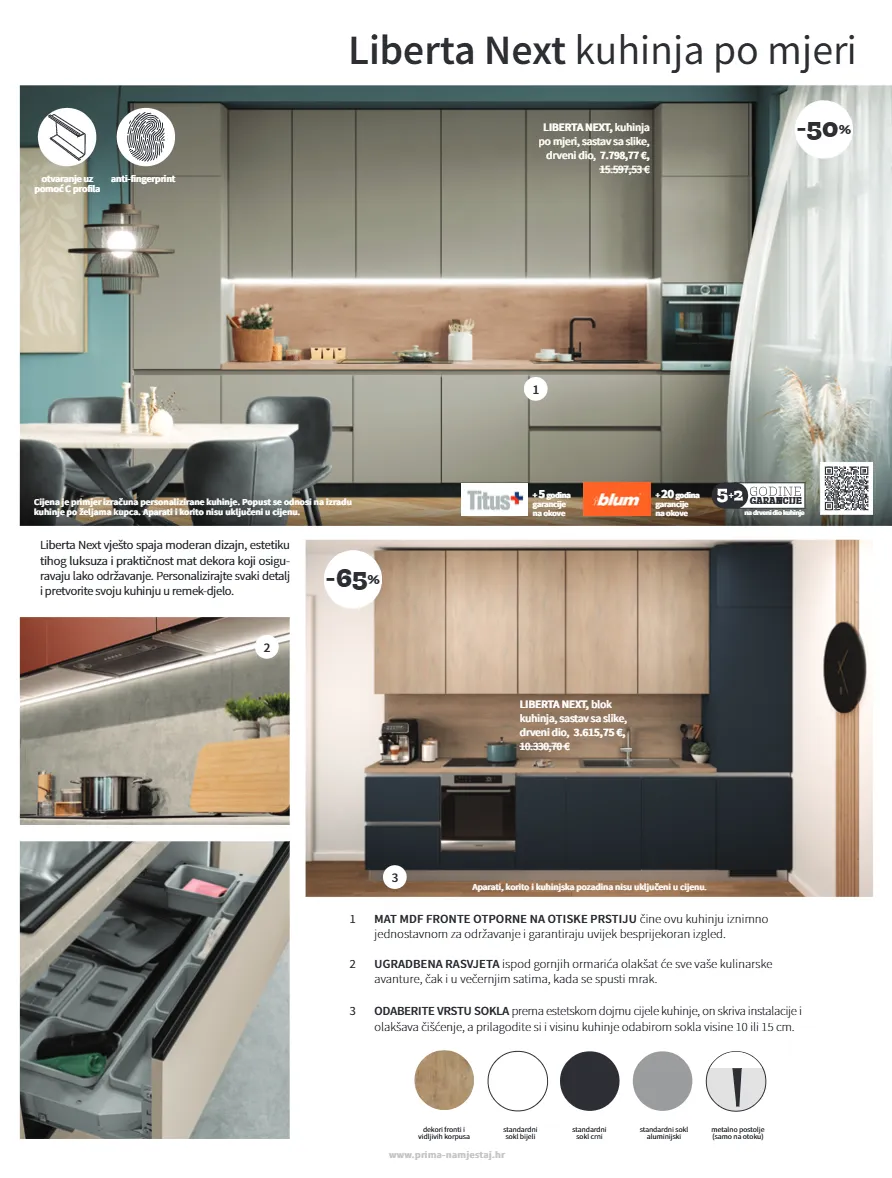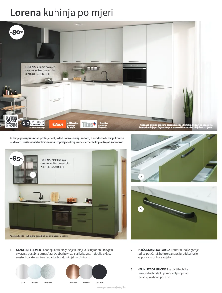 www.prima-namjestaj.hr 1 2 3 4 6 5 odaberite svoju idealnu kombinaciju mdf fronti u velikom spektru boja i dekora te detalje u dekoru drva ili kamena za elemente kao što su radna ploča, sokl te stranice elemenata. 1 ugrađena led rasvjeta stvara posebnu atmosferu, a može biti smještena unutar staklenog elementa ili ispod gornjih elemenata. 3 praktična utičnica nestaje u vašoj radnoj ploči kada ju ne koristite, a pojavljuje se na potisak. 4 vaše fronte mogu biti i staklene , a možete birati između više vrsta stakala i aluminijskih okvira. 2 uskladite sudoper i slavinu s ostalim detaljima u kuhinji. veliki izbor bijele tehnike i opreme za kuhinju čeka vas u prima salonu. usporivači vrata i ladica za bešumno zatvaranje benefiti su svake prima kuhinje po mjeri. čine vašu kuhinju elegantnom, ali i praktičnom za korištenje. 5 6 novu kolekciju kuhinja 2025./2026. kreirali smo u skladu sa svjetskim trendovima i potrebama suvremenog kupca koji u našem studiju za kuhinje može svaki detalj prilagoditi sebi. “ mia zadro produkt dizajnerica cijena je primjer izračuna personalizirane kuhinje. popust se odnosi na izradu kuhinje po željama kupca. aparati i korito nisu uključeni u cijenu. na drveni dio kuhinje garancije + 20 godina garancije na okove + 5 godina garancije na okove linda kuhinja po mjeri profinjena kuhinja linda impresionira detaljima poput okvira fronti, otvorenih metalnih polica i staklenih fronti s rasv - jetom. garantirano će ostaviti vaše goste zavidnima. - 45 % linda, kuhinja po mjeri, sastav sa slike, drveni dio, 6.053,26 € , 11.005,93 €