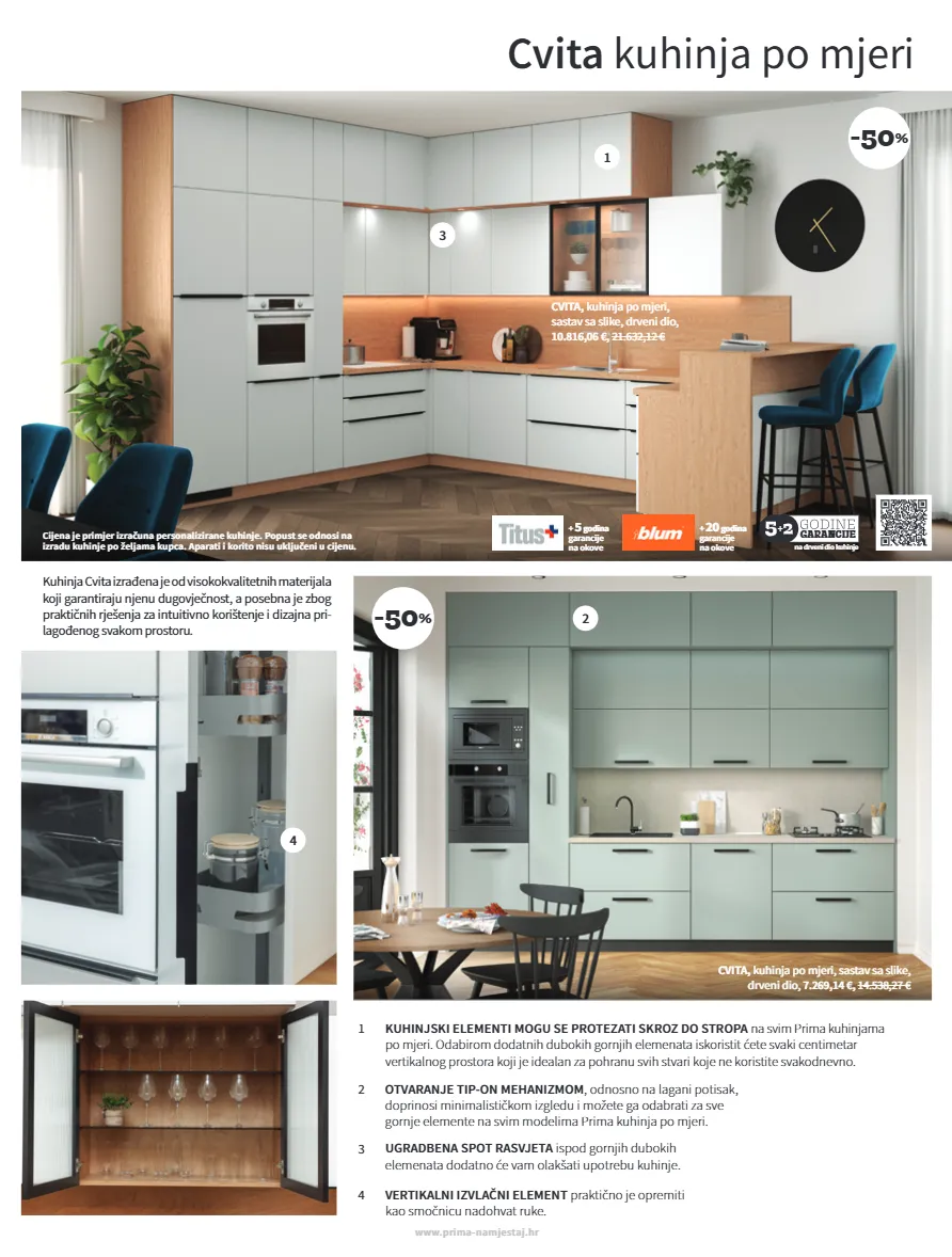 www.prima-namjestaj.hr 1 3 4 kuhinjski elementi mogu se protezati skroz do stropa na svim prima kuhinjama po mjeri. odabirom dodatnih dubokih gornjih elemenata iskoristit ćete svaki centimetar vertikalnog prostora koji je idealan za pohranu svih stvari koje ne koristite svakodnevno. 1 ugradbena spot rasvjeta ispod gornjih dubokih elemenata dodatno će vam olakšati upotrebu kuhinje. 3 vertikalni izvlačni element praktično je opremiti kao smočnicu nadohvat ruke. 4 otvaranje tip-on mehanizmom , odnosno na lagani potisak, doprinosi minimalističkom izgledu i možete ga odabrati za sve gornje elemente na svim modelima prima kuhinja po mjeri. 2 2 cijena je primjer izračuna personalizirane kuhinje. popust se odnosi na izradu kuhinje po željama kupca. aparati i korito nisu uključeni u cijenu. na drveni dio kuhinje garancije + 20 godina garancije na okove + 5 godina garancije na okove cvita kuhinja po mjeri - 50 % - 50 % kuhinja cvita izrađena je od visokokvalitetnih materijala koji garantiraju njenu dugovječnost, a posebna je zbog praktičnih rješenja za intuitivno korištenje i dizajna pri - lagođenog svakom prostoru. cvita, kuhinja po mjeri, sastav sa slike, drveni dio, 10.816,06 €, 21.632,12 € cvita, kuhinja po mjeri, sastav sa slike, drveni dio, 7.269,14 €, 14.538,27 €