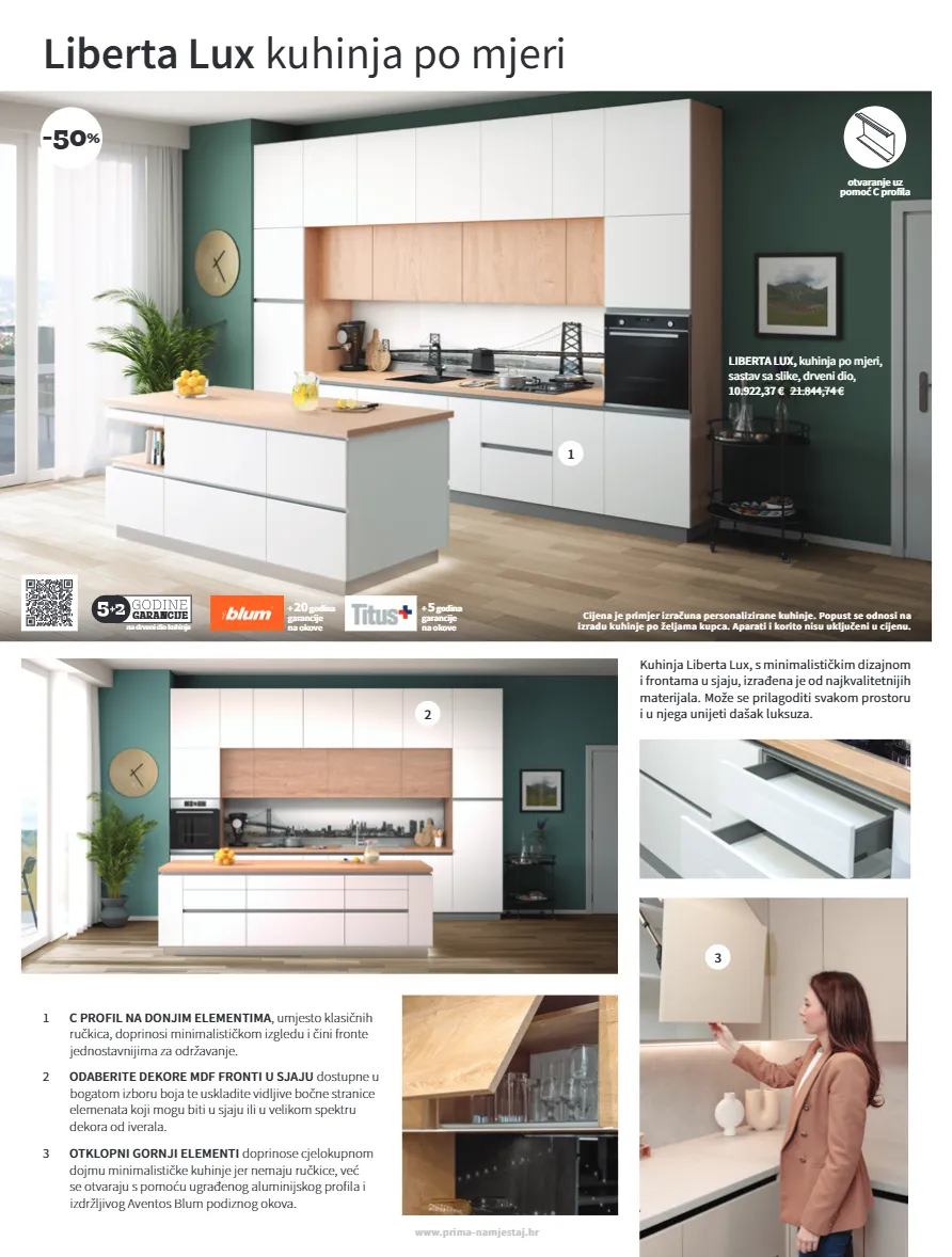 www.prima-namjestaj.hr c profil na donjim elementima , umjesto klasičnih ručkica, doprinosi minimalističkom izgledu i čini fronte jednostavnijima za održavanje. odaberite dekore mdf fronti u sjaju dostupne u bogatom izboru boja te uskladite vidljive bočne stranice elemenata koji mogu biti u sjaju ili u velikom spektru dekora od iverala. otklopni gornji elementi doprinose cjelokupnom dojmu minimalističke kuhinje jer nemaju ručkice, već se otvaraju s pomoću ugrađenog aluminijskog profila i izdržljivog aventos blum podiznog okova. 1 2 3 1 3 otvaranje uz pomoć c profila cijena je primjer izračuna personalizirane kuhinje. popust se odnosi na izradu kuhinje po željama kupca. aparati i korito nisu uključeni u cijenu. na drveni dio kuhinje garancije + 20 godina garancije na okove + 5 godina garancije na okove 2 liberta lux kuhinja po mjeri - 50 % kuhinja liberta lux, s minimalističkim dizajnom i frontama u sjaju, izrađena je od najkvalitetnijih materijala. može se prilagoditi svakom prostoru i u njega unijeti dašak luksuza. liberta lux, kuhinja po mjeri, sastav sa slike, drveni dio, 10.922,37 € 21.844,74 €
