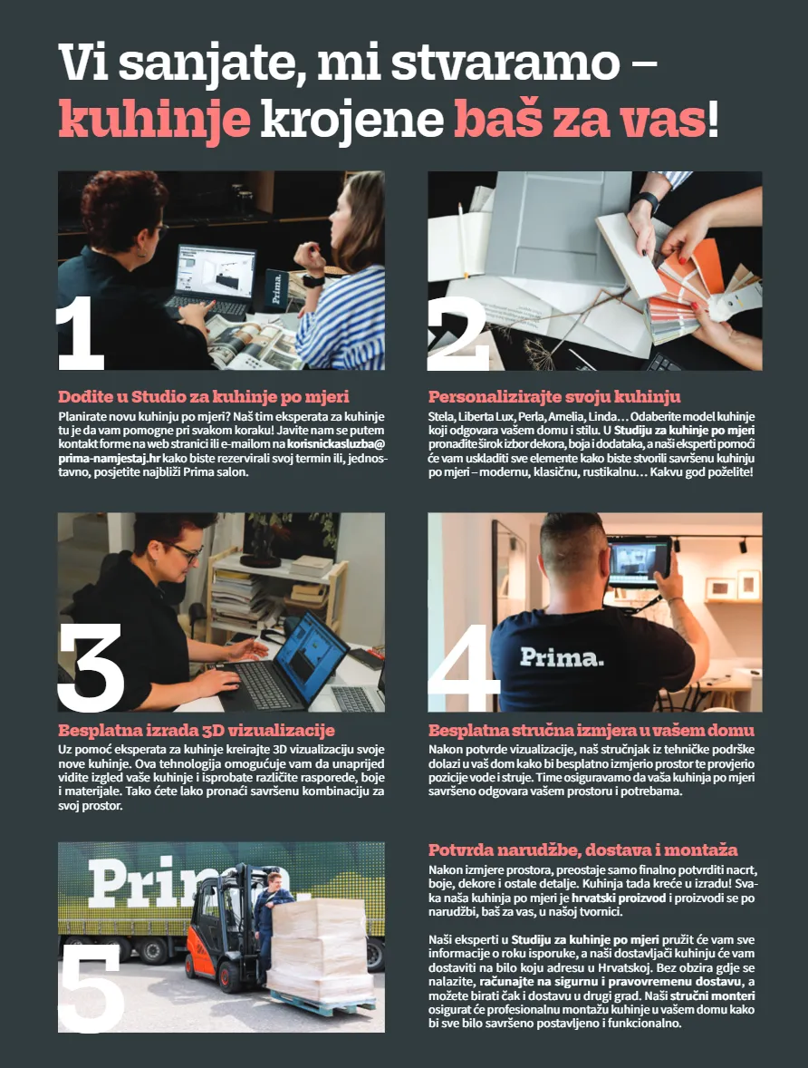 www.prima-namjestaj.hr personalizirajte svoju kuhinju stela, liberta lux, perla, amelia, linda … odaberite model kuhinje koji odgovara vašem domu i stilu. u studiju za kuhinje po mjeri pronađite širok izbor dekora, boja i dodataka, a naši eksperti pomoći će vam uskladiti sve elemente kako biste stvorili savršenu kuhinju po mjeri – modernu, klasičnu, rustikalnu… kakvu god poželite! besplatna stručna izmjera u vašem domu nakon potvrde vizualizacije, naš stručnjak iz tehničke podrške dolazi u vaš dom kako bi besplatno izmjerio prostor te provjerio pozicije vode i struje. time osiguravamo da vaša kuhinja po mjeri savršeno odgovara vašem prostoru i potrebama. dođite u studio za kuhinje po mjeri planirate novu kuhinju po mjeri? naš tim eksperata za kuhinje tu je da vam pomogne pri svakom koraku! javite nam se putem kontakt forme na web stranici ili e-mailom na korisnickasluzba@ prima-namjestaj.hr kako biste rezervirali svoj termin ili, jednos - tavno, posjetite najbliži prima salon. besplatna izrada 3d vizualizacije uz pomoć eksperata za kuhinje kreirajte 3d vizualizaciju svoje nove kuhinje. ova tehnologija omogućuje vam da unaprijed vidite izgled vaše kuhinje i isprobate različite rasporede, boje i materijale. tako ćete lako pronaći savršenu kombinaciju za svoj prostor. potvrda narudžbe, dostava i montaža nakon izmjere prostora, preostaje samo finalno potvrditi nacrt, boje, dekore i ostale detalje. kuhinja tada kreće u izradu! sva - ka naša kuhinja po mjeri je hrvatski proizvod i proizvodi se po narudžbi, baš za vas, u našoj tvornici. naši eksperti u studiju za kuhinje po mjeri pružit će vam sve informacije o roku isporuke, a naši dostavljači kuhinju će vam dostaviti na bilo koju adresu u hrvatskoj. bez obzira gdje se nalazite, računajte na sigurnu i pravovremenu dostavu , a možete birati čak i dostavu u drugi grad. naši stručni monteri osigurat će profesionalnu montažu kuhinje u vašem domu kako bi sve bilo savršeno postavljeno i funkcionalno. 1 3 vi sanjate, mi stvaramo – kuhinje krojene baš za vas ! 2 4 5