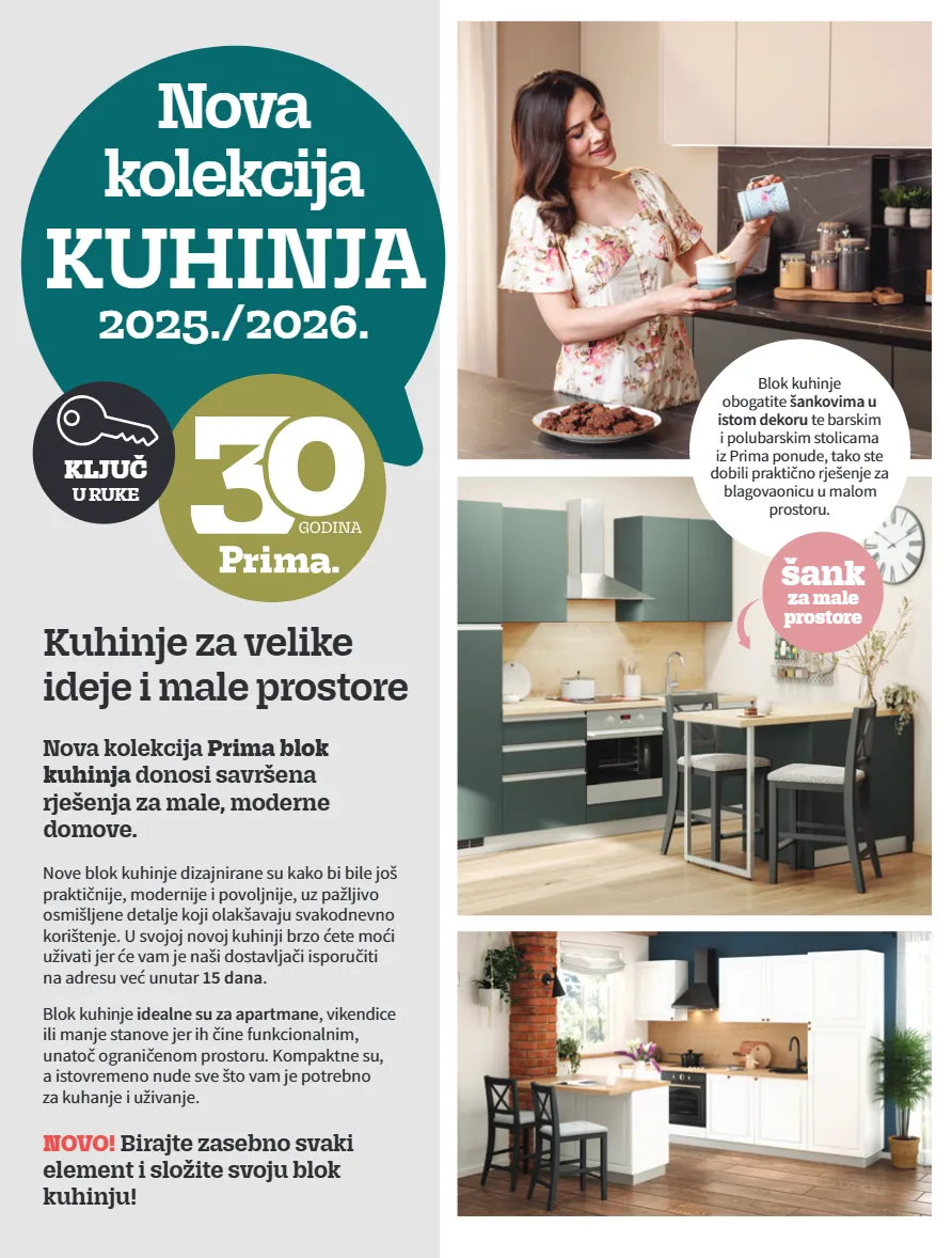 nova kolekcija kuhinja 2025./2026. nova kolekcija prima blok kuhinja donosi savršena rješenja za male, moderne domove. nove blok kuhinje dizajnirane su kako bi bile još praktičnije, modernije i povoljnije, uz pažljivo osmišljene detalje koji olakšavaju svakodnevno korištenje. u svojoj novoj kuhinji brzo ćete moći uživati jer će vam je naši dostavljači isporučiti na adresu već unutar 15 dana . blok kuhinje idealne su za apartmane , vikendice ili manje stanove jer ih čine funkcionalnim, unatoč ograničenom prostoru. kompaktne su, a istovremeno nude sve što vam je potrebno za kuhanje i uživanje. novo! birajte zasebno svaki element i složite svoju blok kuhinju! kuhinje za velike ideje i male prostore ključ u ruke blok kuhinje obogatite šankovima u istom dekoru te barskim i polubarskim stolicama iz prima ponude, tako ste dobili praktično rješenje za blagovaonicu u malom prostoru. šank za male prostore
