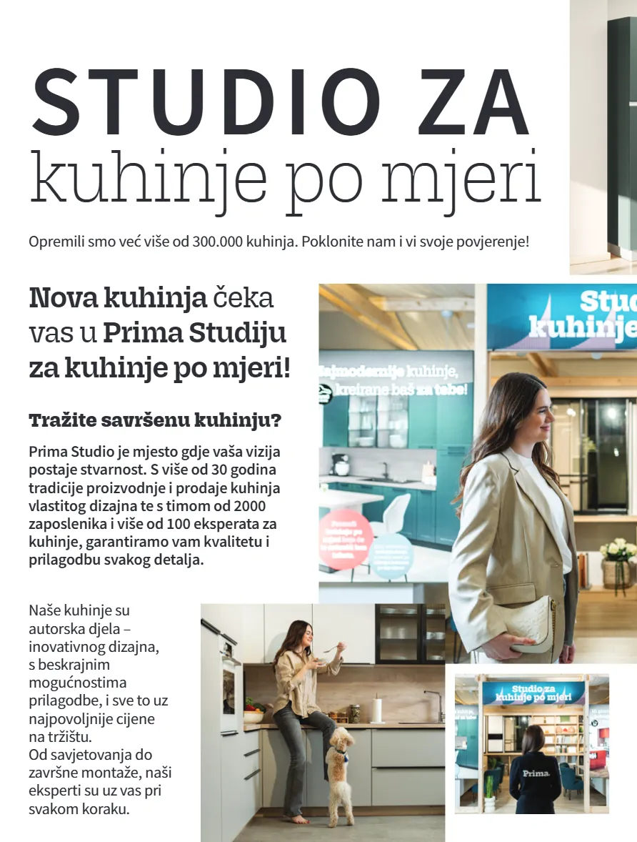 mikrovalna pećnica ugradbena redovna cijena: 1.139,00 € 820, 00 € ploča crna, ugradbena redovna cijena: 1.159,00 € 830, 00 € hladnjak samostojeći redovna cijena: 1.469,00 € 1.050, 00 € pećnica crna, ugradbena redovna cijena: 1.399,00 € 1.000, 00 € napa ugradbena redovna cijena: 999,00 € 720, 00 € perilica posuđa ugradbena redovna cijena: 1.989,00 € 1.430, 00 € 8, 00 9, 60 € € dozator, modern 1l , redovna cijena: 10,00 € stakleni dozator , redovna cijena: 12,00 € 33, 60 € kutija za kruh , redovna cijena: 42,00 € 29, 60 € five retro kuhinjska vaga, redovna cijena: 37,00 € 12, 80 € držač kuhinjskih potrepština , redovna cijena: 16,00 € - 20 % besplatna izmjera u vašem domu! besplatnu izmjeru vršimo i na otocima - zatražite ju u najbližem prima salonu. ponuda u letku traje od 1.9.2025. do 30.9.2025. ili do isteka zaliha. u sve navedene cijene uključeni su popusti i pdv. količine ograničene. nije moguće kumuliranje različitih vrsta popusta ili pogodnosti. dekoracijski dodaci i nenaznačeni ugradbeni električni uređaji nisu uračunati u cijenu proizvoda. ne preuzimamo odgovornost za moguće tiskarske pogreške, razlike u boji, za tehničke promjene, mogućnosti, rok i brzinu isporuke, promjenu postupka ili programa. u slučaju tiskarske pogreške važeći je opis i cijena proizvoda istaknuta na prodajnom mjestu. fotografije su simbolične. zadržavamo pravo promjene cijena. artikli u letku koji imaju oznaku brza isporuka bit će isporučeni u roku od 15 dana. vrijedi za određene tkanine i boje. uštede su uračunate u iskazanim cijenama u letku. uštede vrijede za članove prima kluba pogodnosti. kpl set korito glassix up 40 + armatura siros p chr redovna cijena: 794,00 € 579, 00 € - 27 % - 28 % - 28 % - 28 % - 28 % uhvati priliku! ograničene količine + - 27 % - 28 %
