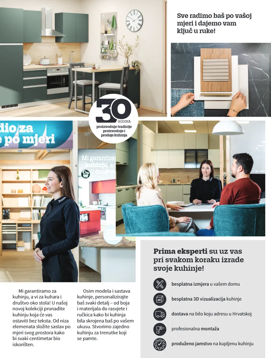 sve radimo baš po vašoj mjeri i dajemo vam ključ u ruke! mi garantiramo za kuhinju, a vi za kuhara i društvo oko stola! u našoj novoj kolekciji pronađite kuhinju koja će vas ostaviti bez teksta. od niza elemenata složite sastav po mjeri svog prostora kako bi svaki centimetar bio iskorišten. osim modela i sastava kuhinje, personalizirajte baš svaki detalj – od boja i materijala do rasvjete i ručkica kako bi kuhinja bila skrojena baš po vašem ukusu. stvorimo zajedno kuhinju za trenutke koji se pamte. prima eksperti su uz vas pri svakom koraku izrade svoje kuhinje! besplatna izmjera u vašem domu besplatna 3d vizualizacija kuhinje dostava na bilo koju adresu u hrvatskoj profesionalna montaža produženo jamstvo na kupljenu kuhinju proizvodnje tradicije proizvodnje i prodaje kuhinja