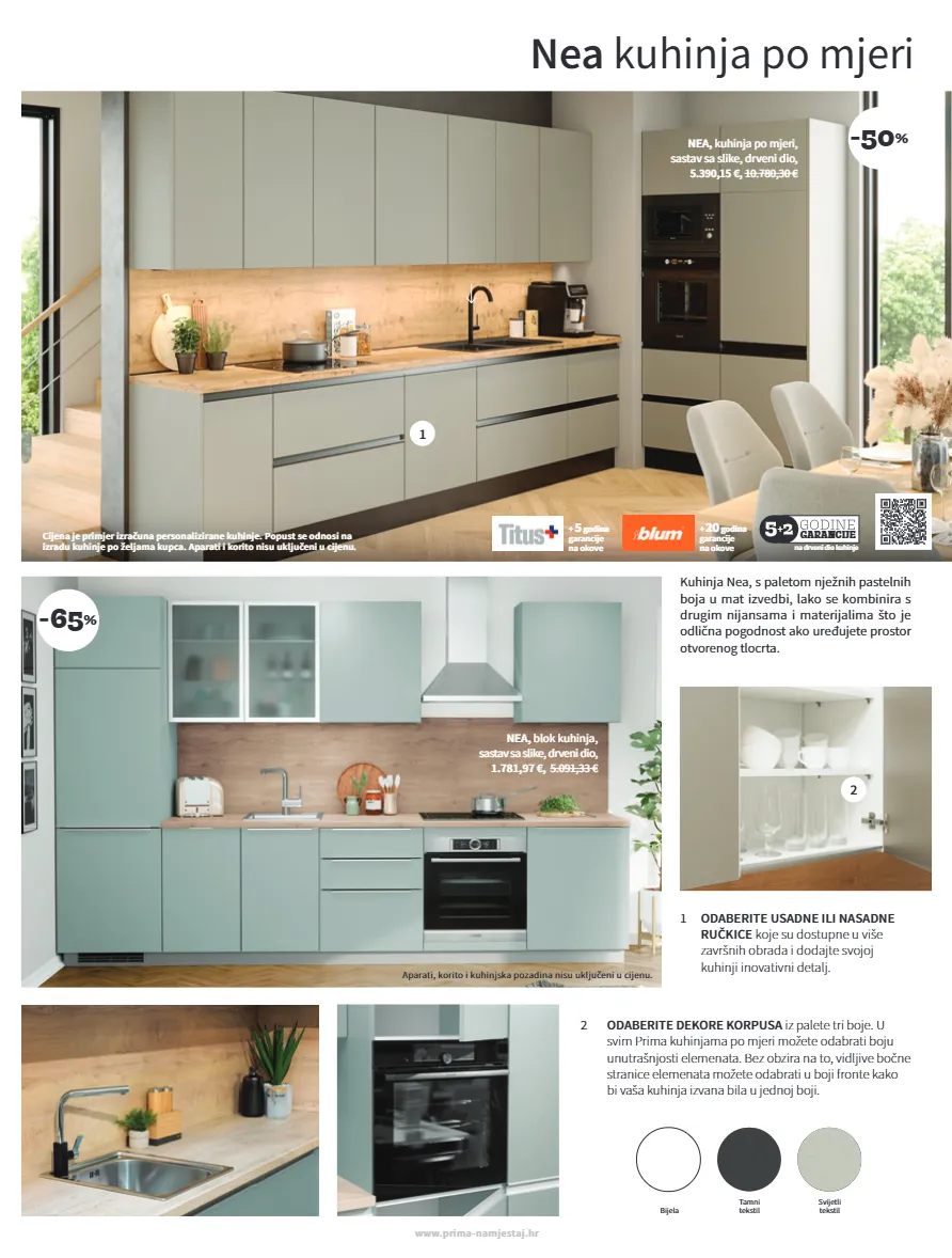 www.prima-namjestaj.hr 1 2 odaberite usadne ili nasadne ručkice koje su dostupne u više završnih obrada i dodajte svojoj kuhinji inovativni detalj. 1 odaberite dekore korpusa iz palete tri boje. u svim prima kuhinjama po mjeri možete odabrati boju unutrašnjosti elemenata. bez obzira na to, vidljive bočne stranice elemenata možete odabrati u boji fronte kako bi vaša kuhinja izvana bila u jednoj boji. 2 tamni tekstil svijetli tekstil bijela na drveni dio kuhinje garancije + 20 godina garancije na okove + 5 godina garancije na okove aparati, korito i kuhinjska pozadina nisu uključeni u cijenu. nea kuhinja po mjeri - 65 % - 50 % cijena je primjer izračuna personalizirane kuhinje. popust se odnosi na izradu kuhinje po željama kupca. aparati i korito nisu uključeni u cijenu. nea, kuhinja po mjeri, sastav sa slike, drveni dio, 5.390,15 €, 10.780,30 € nea, blok kuhinja, sastav sa slike, drveni dio, 1.781,97 €, 5.091,33 € kuhinja nea, s paletom nježnih pastelnih boja u mat izvedbi, lako se kombinira s drugim nijansama i materijalima što je odlična pogodnost ako uređujete prostor otvorenog tlocrta.