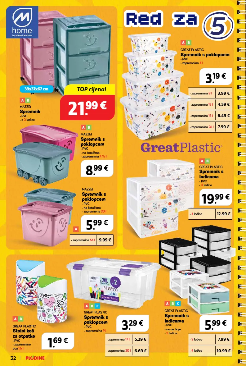 HIT cijena! Već od TOP cijena! 21 21 . . 99 € 99 € 1 1 . . 69 69 € 5 5 . . 99 99 € A A B GREAT PLASTIC Spremnik s poklopcem • PVC • zapremnina 4 l A B C GREAT PLASTIC Spremnik s poklopcem • PVC • zapremnina 9 l A B C GREAT PLASTIC Spremnik s ladicama • PVC • razne boje • 2 ladice A B GREAT PLASTIC Stolni koš za otpatke • PVC • zapremnine cca 1,5 l MAZZEI Spremnik s poklopcem • PVC • na kotačima • zapremnina 30 l 8 8 . . 99 99 € MAZZEI Spremnik • PVC • s 3 ladice A B 3 3 . . 19 19 € • zapremnina 8 l 3.99 € • zapremnina 12 l 4.59 € • zapremnina 15 l 6.49 € • zapremnina 26 l 7.99 € 3 3 . . 29 29 € • zapremnina 17 l 5.29 € • zapremnina 20 l 6.69 € • zapremnina 64 l 9.99 € 5 5 . . 99 99 € • 3 ladice 7.99 € • 4 ladice 10.99 € A B GREAT PLASTIC Spremnik s ladicama • PVC • 3 ladice 19 19 . . 99 99 € • 4 ladice 12.99 € A B MAZZEI Spremnik s poklopcem • PVC • na kotačima • zapremnina 47,5 l 39x37x67 cm Red za 5 32