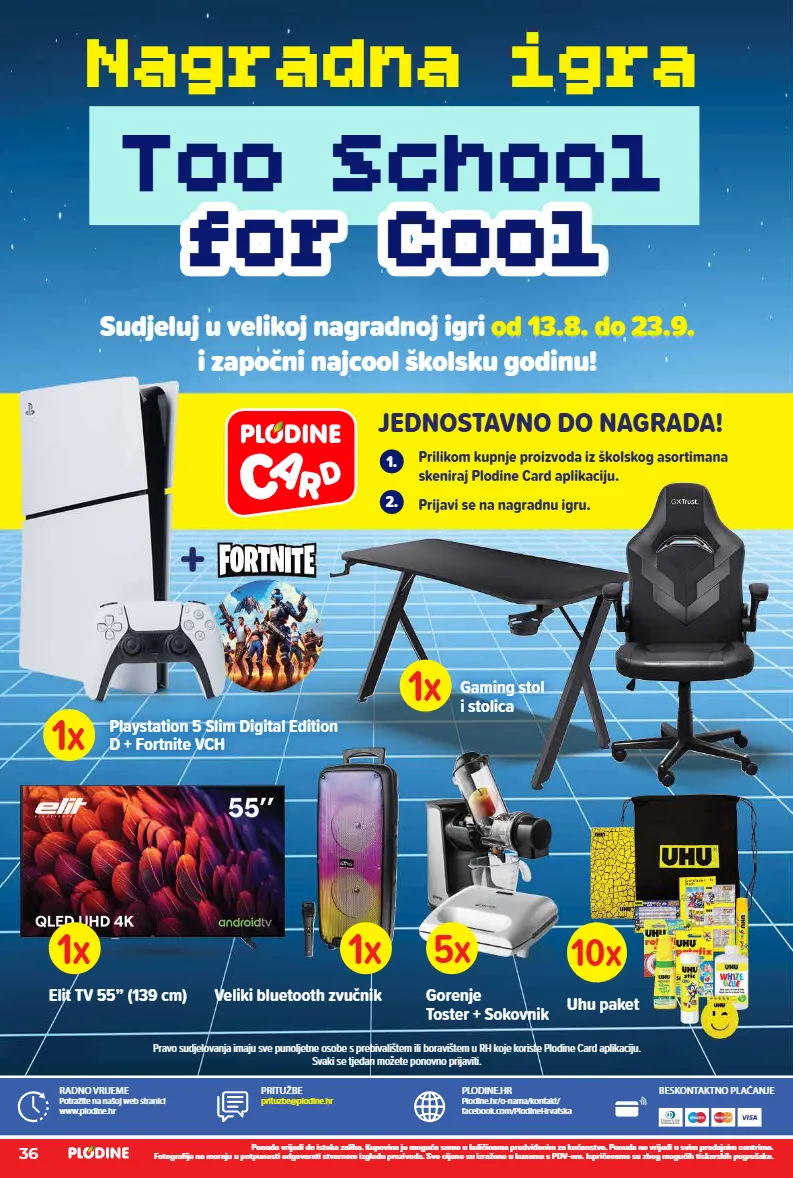 pravo sudjelovanja imaju sve punoljetne osobe s prebivalištem ili boravištem u rh koje koriste plodine card aplikaciju. svaki se tjedan možete ponovno prijaviti. 1x playstation 5 slim digital edition d + fortnite vch 1x gaming stol i stolica too school for cool nagradna igra sudjeluj u velikoj nagradnoj igri od 13.8. do 23.9. i započni najcool školsku godinu! jednostavno do nagrada! prilikom kupnje proizvoda iz školskog asortimana skeniraj plodine card aplikaciju. prijavi se na nagradnu igru. 1. 2. 1x elit tv 55” (139 cm) 1x veliki bluetooth zvučnik 5x gorenje toster + sokovnik 10x uhu paket ponuda vrijedi do isteka zaliha. kupovina je moguća samo u količinama predviđenim za kućanstvo. ponuda ne vrijedi u svim prodajnim centrima. fotografije ne moraju u potpunosti odgovarati stvarnom izgledu prozivoda. sve cijene su izražene u kunama s pdv-om. ispričavamo se zbog mogućih tiskarskih pogrešaka. 36 radno vrijeme potražite na našoj web stranici www.plodine.hr pritužbe prituzbe@plodine.hr plodine.hr plodine.hr/o-nama/kontakt/ facebook.com/plodinehrvatska beskontaktno plaćanje