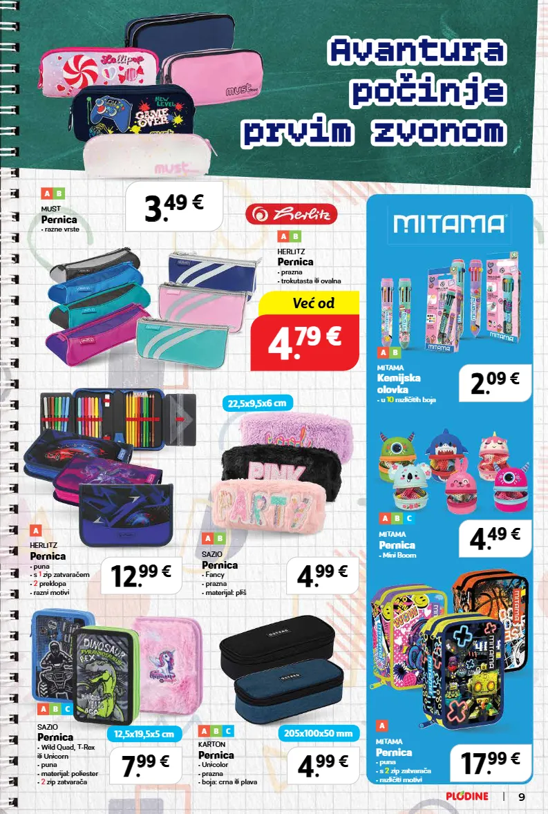 4 4 . . 49 49 € 2 2 . . 09 09 € 17 17 . . 99 99 € mitama pernica • mini boom a b c 3 3 . . 49 49 € must pernica • razne vrste a b 4 4 . . 99 99 € mitama pernica • puna • s 2 zip zatvarača • različiti motivi a mitama kemijska olovka • u 10 različitih boja a b hit cijena! već od 4 4 . . 79 € 79 € 7 7 . . 99 99 € 4 4 . . 99 99 € 12 12 . . 99 99 € herlitz pernica • puna • s 1 zip zatvaračem • 2 preklopa • razni motivi a karton pernica • unicolor • prazna • boja: crna ili plava a b c sazio pernica • wild quad, t-rex ili unicorn • puna • materijal: poliester • 2 zip zatvarača a b c sazio pernica • fancy • prazna • materijal: pliš a b herlitz pernica • prazna • trokutasta ili ovalna a b avantura počinje prvim zvonom 12,5x19,5x5 cm 22,5x9,5x6 cm 205x100x50 mm 9