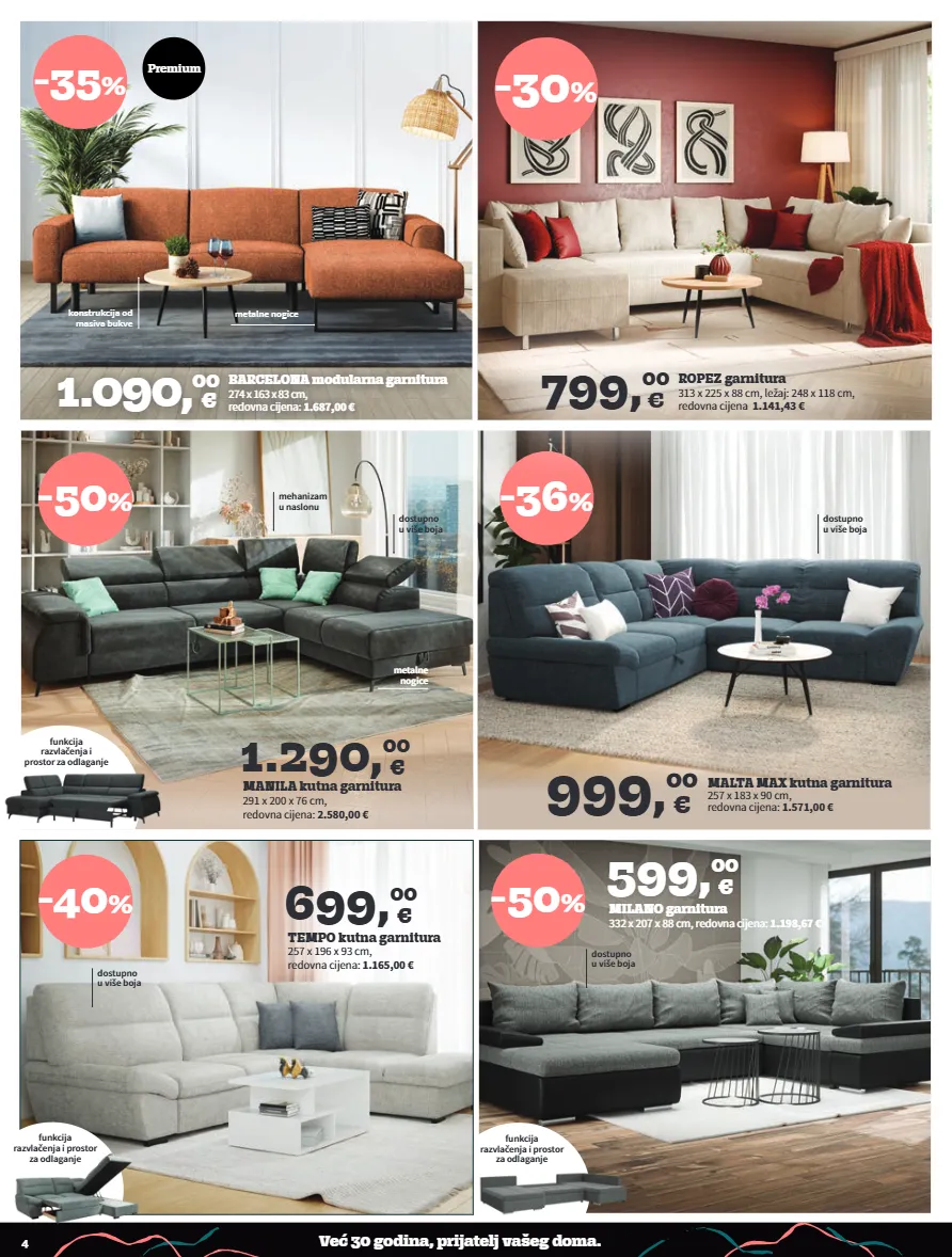 4 već 30 godina, prijatelj vašeg doma. metalne nogice mehanizam u naslonu dostupno u više boja - 50 % malta max kutna garnitura 257 x 183 x 90 cm, redovna cijena: 1.571,00 € 999 , 00 € - 36 % funkcija razvlačenja i prostor za odlaganje dostupno u više boja milano garnitura 332 x 207 x 88 cm, redovna cijena: 1.198,67 € 599, 00 € premium metalne nogice barcelona modularna garnitura 274 x 163 x 83 cm, redovna cijena: 1.687,00 € 1.090, 00 € konstrukcija od masiva bukve - 35 % tempo kutna garnitura 257 x 196 x 93 cm, redovna cijena: 1.165,00 € 699, 00 € dostupno u više boja funkcija razvlačenja i prostor za odlaganje - 40 % - 50 % 1.290, 00 € manila kutna garnitura 291 x 200 x 76 cm, redovna cijena: 2.580,00 € funkcija razvlačenja i prostor za odlaganje dostupno u više boja ropez garnitura 313 x 225 x 88 cm, ležaj: 248 x 118 cm, redovna cijena 1.141,43 € 799, 00 € - 30 %