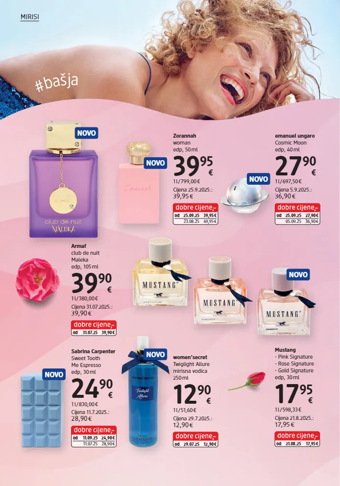 emanuel ungaro Cosmic Moon edp, 40 ml 27 90 € 1 l / 697,50 € Cijena 5.9.2025.: 36,90 € od 25.09.25 27,90 € 05.09.25 36,90 € Zorannah woman edp, 50 ml 39 95 € 1 l / 799,00 € Cijena 25.9.2025.: 39,95 € od 25.09.25 39,95 € 23.08.25 49,95 € Mustang - Pink Signature - Rose Signature - Gold Signature edp, 30 ml 17 95 € 1 l / 598,33 € Cijena 21.8.2025.: 17,95 € od 21.08.25 17,95 € Armaf club de nuit Maleka edp, 105 ml 39 90 € 1 l / 380,00 € Cijena 31.07.2025.: 39,90 € od 31.07.25 39,90 € Sabrina Carpenter Sweet Tooth Me Espresso edp, 30 ml 24 90 € 1 l / 830,00 € Cijena 11.7.2025.: 28,90 € od 11.09.25 24,90 € 11.07.25 28,90 € women'secret Twiglight Allure mirisna vodica 250 ml 12 90 € 1 l / 51,60 € Cijena 29.7.2025.: 12,90 € od 29.07.25 12,90 € NOVO NOVO NOVO NOVO NOVO NOVO MIRISI