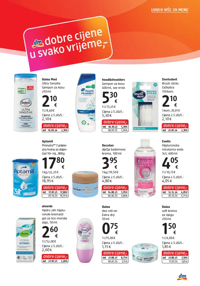 balea deo roll-on extra dry 50 ml 0 75 € 1 l /15,00 € cijena 2.5.2025.: 1,15 € od 21.08.25 0,75 € 09.05.24 1,15 € head&shoulders šampon za kosu 400 ml, sve vrste 5 30 € 1 l / 13,25 € cijena 2.5.2025.: 5,30 € od 02.01.23 5,30 € 08.09.22 5,96 € balea med ultra sensitiv šampon za kosu 250 ml 2 10 € 1 l / 8,40 € cijena 2.5.2025.: 2,10 € od 16.05.24 2,10 € alverde hydro 24h hijalu- ronski kremasti gel za lice morske alge, 50 ml 2 60 € 1 l / 52,00 € cijena 2.5.2025.: 2,60 € od 27.07.23 2,60 € aptamil pronutra™ 3 pri je la - zna hrana za do jen - čad 10+ mj., 800 g 17 80 € 1 kg / 22,25 € cijena 2.5.2025.: 18,95 € od 17.07.25 17,80 € 03.10.24 18,95 € becutan dječja bademova krema, 100 ml 3 95 € 1 kg / 39,50 € cijena 2.5.2025.: 4,80 € od 14.08.25 3,95 € 06.06.24 4,80 € evelin hijaluronska micelarna voda 3u1, 400 ml 4 05 € 1 l / 10,13 € cijena 2.5.2025.: 4,05 € od 12.12.24 4,05 € 03.10.24 4,75 € balea soft krema za njegu 250 ml 1 50 € 1 l / 6,00 € cijena 2.5.2025.: 1,85 € od 21.08.25 1,50 € 11.01.24 1,85 € dontodent brush sticks čačkalice 150 kom. 2 10 € 1 kom. /0,01 € cijena 2.5.2025.: 2,10 € od 25.07.24 2,10 € uvijek više za mene