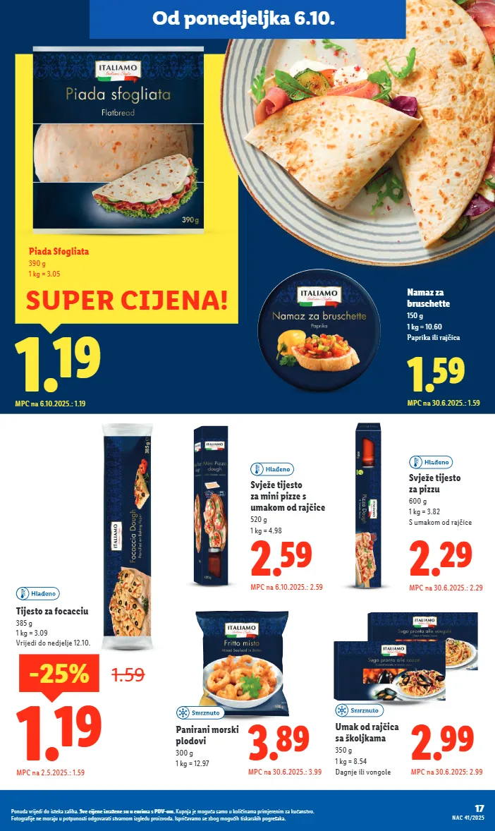 od ponedjeljka 1.9. od ponedjeljka 6.10. 2.29 mpc na 30.6.2025.: 2.29 svježe tijesto za pizzu 600 g 1 kg = 3.82 s umakom od rajčice 2.59 mpc na 6.10.2025.: 2.59 svježe tijesto za mini pizze s umakom od rajčice 520 g 1 kg = 4.98 3.89 mpc na 30.6.2025.: 3.99 panirani morski plodovi 300 g 1 kg = 12.97 2.99 mpc na 30.6.2025: 2.99 umak od rajčica sa školjkama 350 g 1 kg = 8.54 dagnje ili vongole namaz za bruschette 150 g 1 kg = 10.60 paprika ili rajčica 1.59 mpc na 30.6.2025.: 1.59 1.19 1.59 mpc na 2.5.2025.: 1.59 -25% tijesto za focacciu 385 g 1 kg = 3.09 vrijedi do nedjelje 12.10. 1.19 mpc na 6.10.2025.: 1.19 super cijena! piada sfogliata 390 g 1 kg = 3.05 17 ponuda vrijedi do isteka zaliha. sve cijene izražene su u eurima s pdv-om. kupnja je moguća samo u količinama primjerenim za kućanstvo. fotografije ne moraju u potpunosti odgovarati stvarnom izgledu proizvoda. ispričavamo se zbog mogućih tiskarskih pogrešaka. nac 41/2025