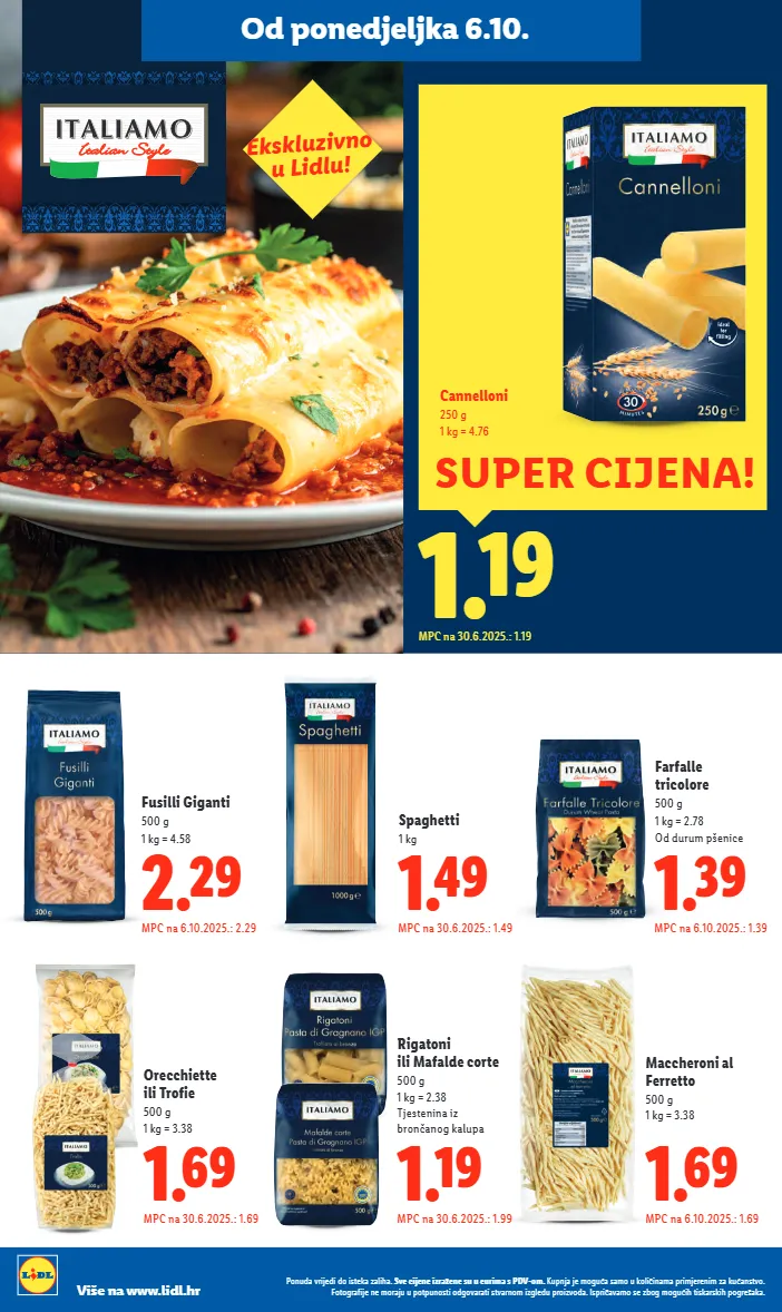 1.49 mpc na 30.6.2025.: 1.49 spaghetti 1 kg ekskluzivno u lidlu! 2.29 mpc na 6.10.2025.: 2.29 fusilli giganti 500 g 1 kg = 4.58 1.39 mpc na 6.10.2025.: 1.39 farfalle tricolore 500 g 1 kg = 2.78 od durum pšenice 1.69 mpc na 30.6.2025.: 1.69 orecchiette ili trofie 500 g 1 kg = 3.38 1.19 mpc na 30.6.2025.: 1.99 rigatoni ili mafalde corte 500 g 1 kg = 2.38 tjestenina iz brončanog kalupa maccheroni al ferretto 500 g 1 kg = 3.38 1.69 mpc na 6.10.2025.: 1.69 1.19 mpc na 30.6.2025.: 1.19 super cijena! cannelloni 250 g 1 kg = 4.76 od ponedjeljka 6.10. ponuda vrijedi do isteka zaliha. sve cijene izražene su u eurima s pdv-om. kupnja je moguća samo u količinama primjerenim za kućanstvo. fotografije ne moraju u potpunosti odgovarati stvarnom izgledu proizvoda. ispričavamo se zbog mogućih tiskarskih pogrešaka. više na www.lidl.hr