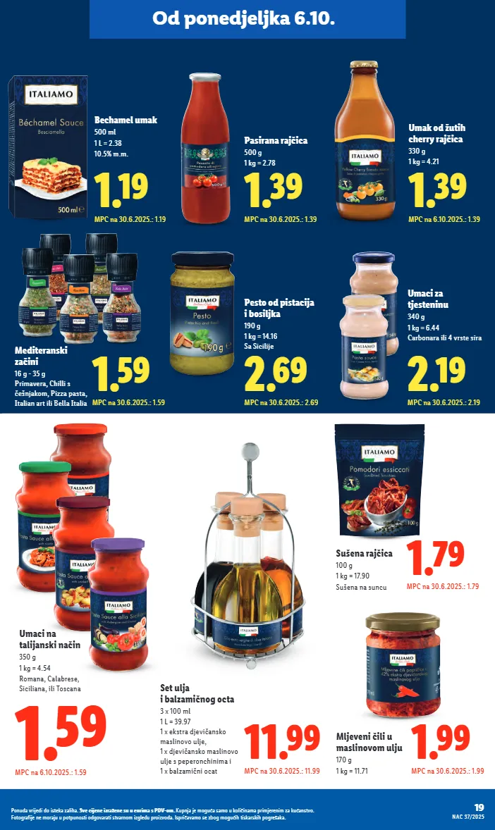 1.79 mpc na 30.6.2025.: 1.79 sušena rajčica 100 g 1 kg = 17.90 sušena na suncu 2.69 mpc na 30.6.2025.: 2.69 pesto od pistacija i bosiljka 190 g 1 kg = 14.16 sa sicilije od ponedjeljka 6.10. 1.99 mpc na 30.6.2025.: 1.99 mljeveni čili u maslinovom ulju 170 g 1 kg = 11.71 1.19 mpc na 30.6.2025.: 1.19 bechamel umak 500 ml 1 l = 2.38 10.5% m.m. 2.19 mpc na 30.6.2025.: 2.19 umaci za tjesteninu 340 g 1 kg = 6.44 carbonara ili 4 vrste sira 1.39 mpc na 6.10.2025.: 1.39 umak od žutih cherry rajčica 330 g 1 kg = 4.21 1.39 mpc na 30.6.2025.: 1.39 pasirana rajčica 500 g 1 kg = 2.78 1.59 mpc na 6.10.2025.: 1.59 umaci na talijanski način 350 g 1 kg = 4.54 romana, calabrese, siciliana, ili toscana 11.99 mpc na 30.6.2025.: 11.99 set ulja i balzamičnog octa 3 x 100 ml 1 l = 39.97 1 x ekstra djevičansko maslinovo ulje, 1 x djevičansko maslinovo ulje s peperonchinima i 1 x balzamični ocat 1.59 mpc na 30.6.2025.: 1.59 mediteranski začini 16 g - 35 g primavera, chilli s češnjakom, pizza pasta, italian art ili bella italia 19 nac 37/2025 ponuda vrijedi do isteka zaliha. sve cijene izražene su u eurima s pdv-om. kupnja je moguća samo u količinama primjerenim za kućanstvo. fotografije ne moraju u potpunosti odgovarati stvarnom izgledu proizvoda. ispričavamo se zbog mogućih tiskarskih pogrešaka.