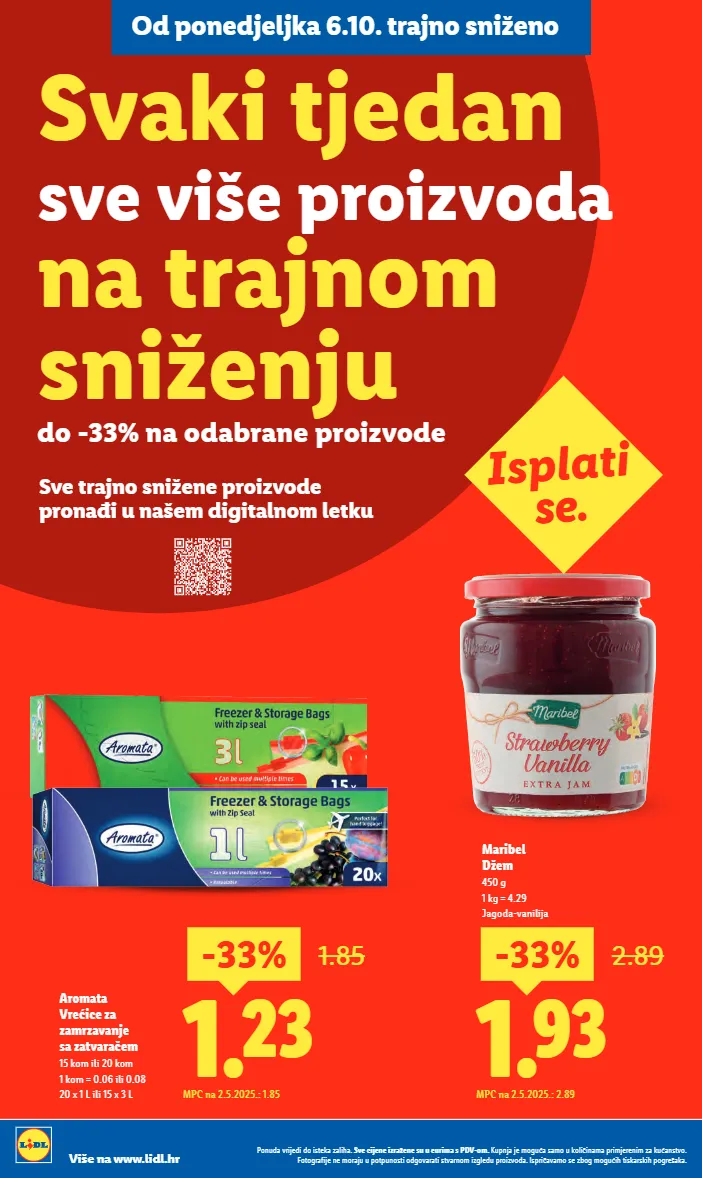 Isplati se. Svaki tjedan sve više proizvoda na trajnom sniženju do -33% na odabrane proizvode Sve trajno snižene proizvode pronađi u našem digitalnom letku Od ponedjeljka 6.10. trajno sniženo Maribel Džem 450 g 1 kg = 4.29 Jagoda-vanilija 1.23 1.85 MPC na 2.5.2025.: 1.85 -33% 1.93 2.89 MPC na 2.5.2025.: 2.89 -33% Aromata Vrećice za zamrzavanje sa zatvaračem 15 kom ili 20 kom 1 kom = 0.06 ili 0.08 20 x 1 L ili 15 x 3 L Ponuda vrijedi do isteka zaliha. Sve cijene izražene su u eurima s PDV-om. Kupnja je moguća samo u količinama primjerenim za kućanstvo. Fotografije ne moraju u potpunosti odgovarati stvarnom izgledu proizvoda. Ispričavamo se zbog mogućih tiskarskih pogrešaka. Više na www.lidl.hr