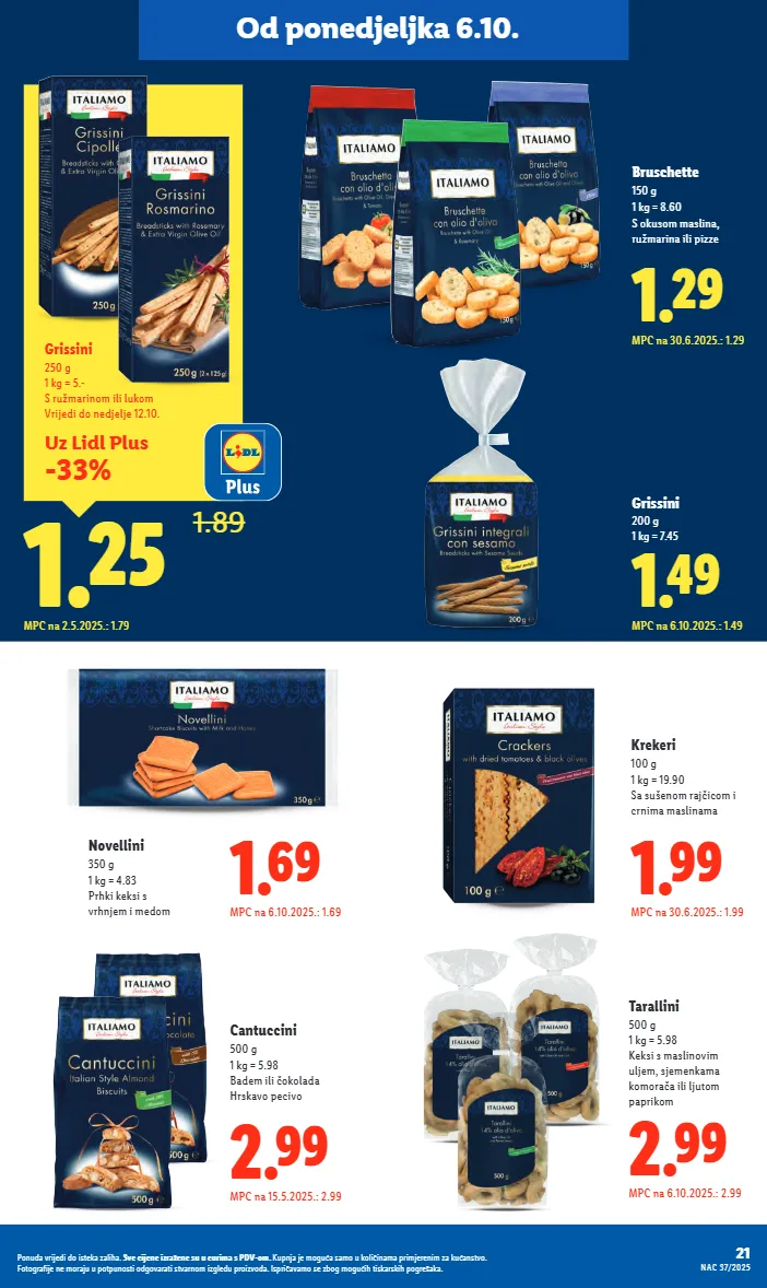 1.29 mpc na 30.6.2025.: 1.29 bruschette 150 g 1 kg = 8.60 s okusom maslina, ružmarina ili pizze 2.99 mpc na 6.10.2025.: 2.99 tarallini 500 g 1 kg = 5.98 keksi s maslinovim uljem, sjemenkama komorača ili ljutom paprikom 1.49 mpc na 6.10.2025.: 1.49 grissini 200 g 1 kg = 7.45 1.99 mpc na 30.6.2025.: 1.99 krekeri 100 g 1 kg = 19.90 sa sušenom rajčicom i crnima maslinama od ponedjeljka 6.10. 1.69 mpc na 6.10.2025.: 1.69 novellini 350 g 1 kg = 4.83 prhki keksi s vrhnjem i medom cantuccini 500 g 1 kg = 5.98 badem ili čokolada hrskavo pecivo 2.99 mpc na 15.5.2025.: 2.99 uz lidl plus -33% 1.25 1.89 grissini 250 g 1 kg = 5.- s ružmarinom ili lukom vrijedi do nedjelje 12.10. mpc na 2.5.2025.: 1.79 21 nac 37/2025 ponuda vrijedi do isteka zaliha. sve cijene izražene su u eurima s pdv-om. kupnja je moguća samo u količinama primjerenim za kućanstvo. fotografije ne moraju u potpunosti odgovarati stvarnom izgledu proizvoda. ispričavamo se zbog mogućih tiskarskih pogrešaka.