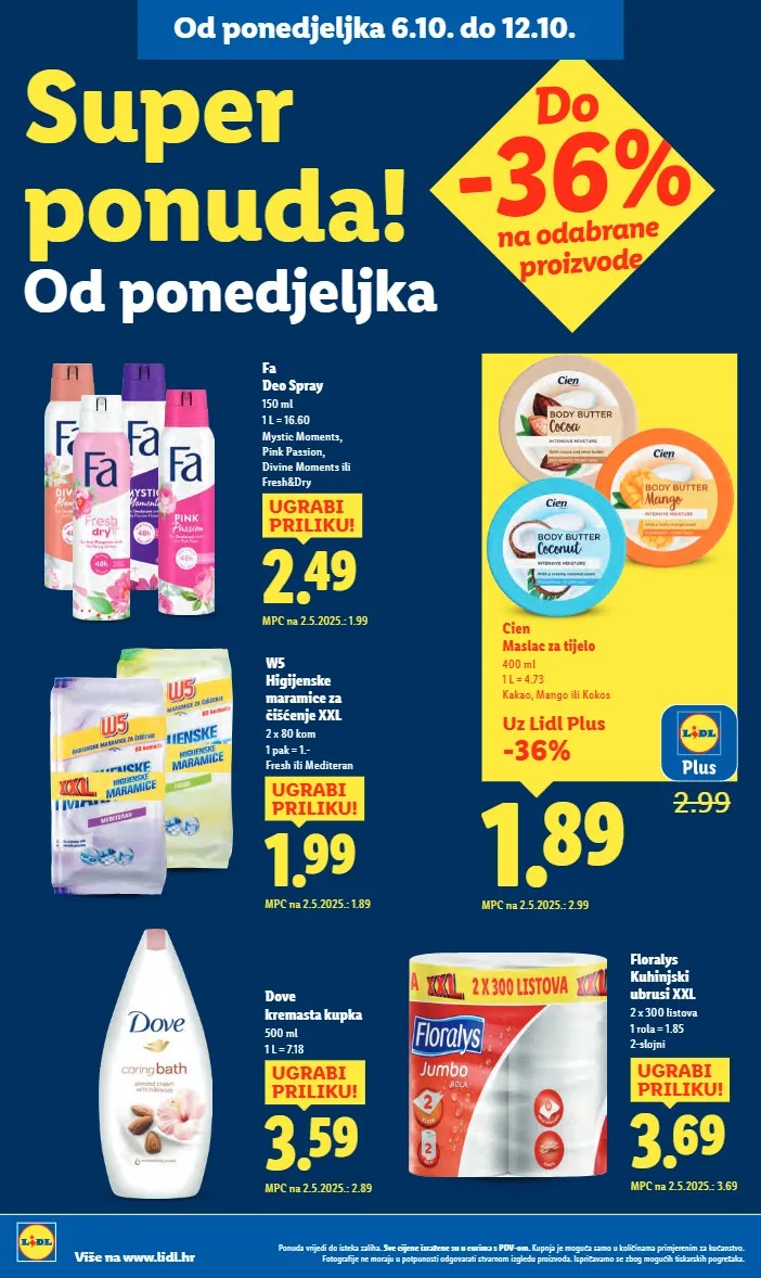 tvoj tjedan počinje u lidlu do -xx% na odabrane proizvode super ponuda! od ponedjeljka do -36% na odabrane proizvode floralys kuhinjski ubrusi xxl 2 x 300 listova 1 rola = 1.85 2-slojni 3.69 ugrabi priliku! mpc na 2.5.2025.: 3.69 w5 higijenske maramice za čišćenje xxl 2 x 80 kom 1 pak = 1.- fresh ili mediteran fa deo spray 150 ml 1 l = 16.60 mystic moments, pink passion, divine moments ili fresh&dry 1.99 ugrabi priliku! mpc na 2.5.2025.: 1.89 2.49 ugrabi priliku! mpc na 2.5.2025.: 1.99 uz lidl plus -36% 1.89 2.99 cien maslac za tijelo 400 ml 1 l = 4.73 kakao, mango ili kokos mpc na 2.5.2025.: 2.99 dove kremasta kupka 500 ml 1 l = 7.18 3.59 ugrabi priliku! mpc na 2.5.2025.: 2.89 ponuda vrijedi do isteka zaliha. sve cijene izražene su u eurima s pdv-om. kupnja je moguća samo u količinama primjerenim za kućanstvo. fotografije ne moraju u potpunosti odgovarati stvarnom izgledu proizvoda. ispričavamo se zbog mogućih tiskarskih pogrešaka. više na www.lidl.hr od ponedjeljka 6.10. do 12.10.