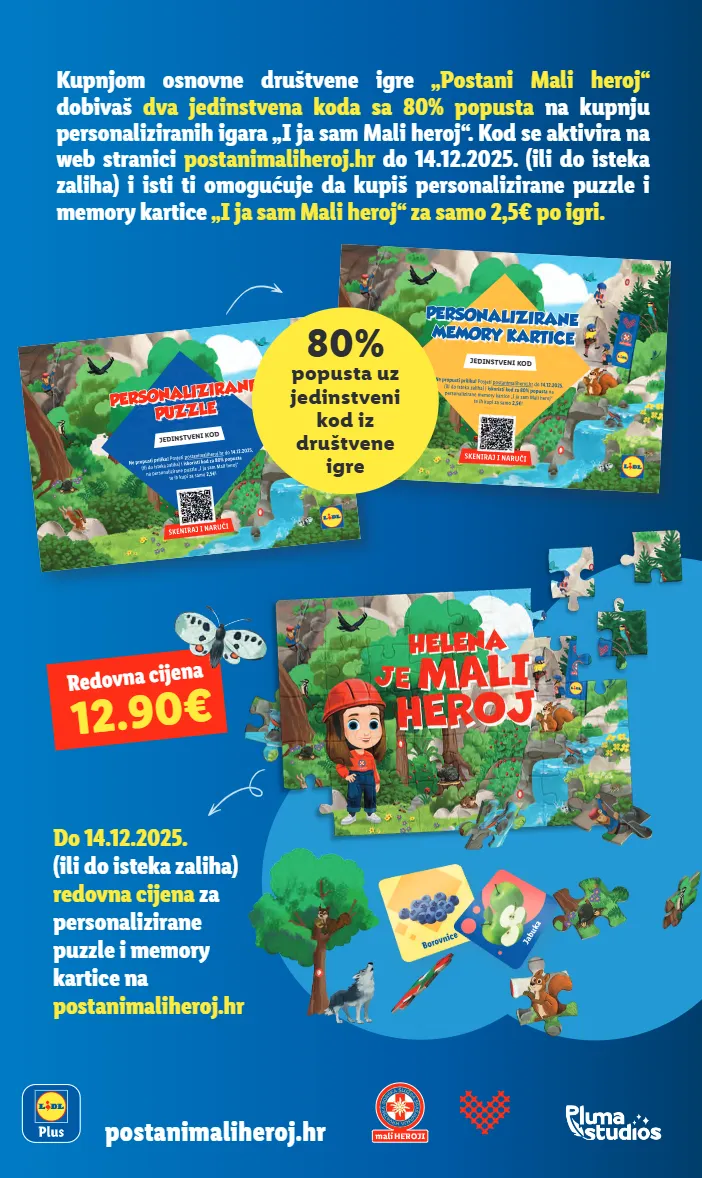 Kupnjom osnovne društvene igre „Postani Mali heroj“ dobivaš dva jedinstvena koda sa 80% popusta na kupnju personaliziranih igara „I ja sam Mali heroj“. Kod se aktivira na web stranici postanimaliheroj.hr do 14.12.2025. (ili do isteka zaliha) i isti ti omogućuje da kupiš personalizirane puzzle i memory kartice „I ja sam Mali heroj“ za samo 2,5€ po igri. 12.90€ Redovna cijena postanimaliheroj.hr JEDINSTVENI KOD JEDINSTVENI KOD 80% popusta uz jedinstveni kod iz društvene igre Do 14.12.2025. (ili do isteka zaliha) redovna cijena za personalizirane puzzle i memory kartice na postanimaliheroj.hr
