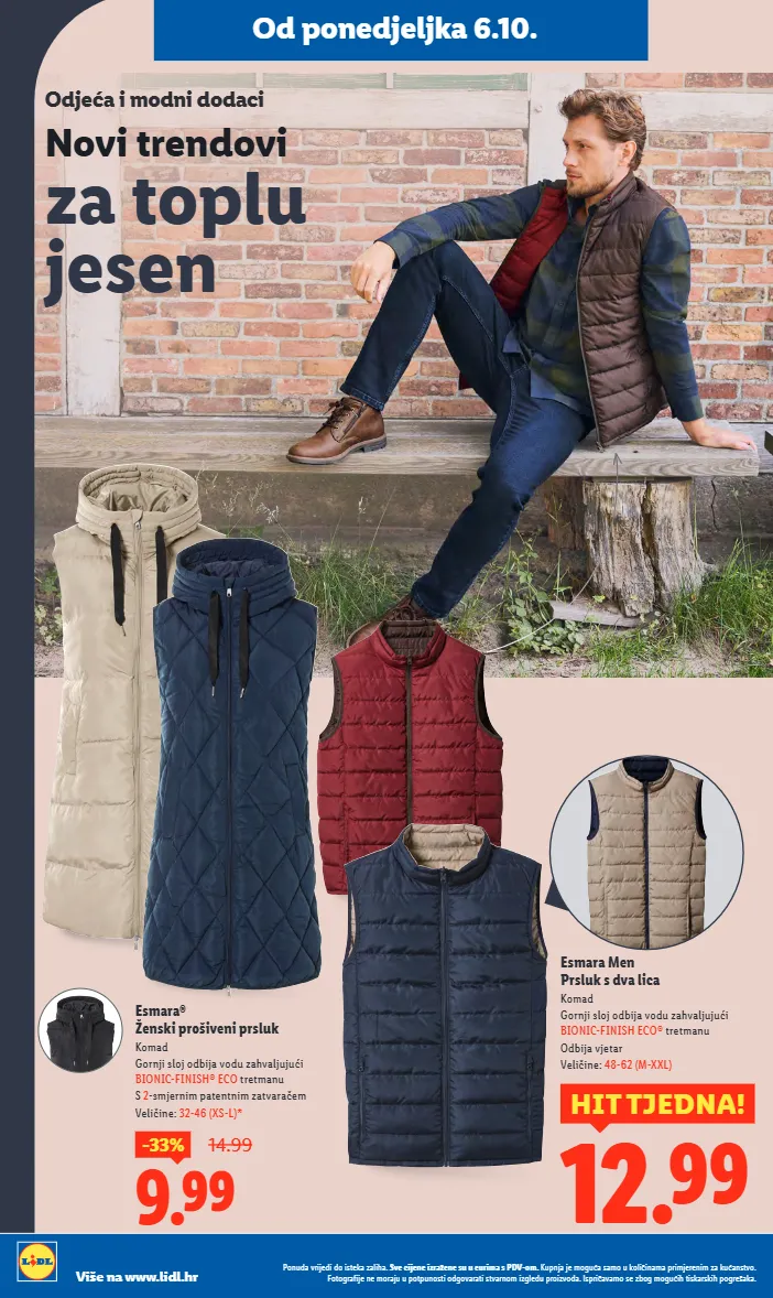 Od ponedjeljka 22.9. Esmara Men Prsluk s dva lica Komad Gornji sloj odbija vodu zahvaljujući BIONIC-FINISH ECO ® tretmanu Odbija vjetar Veličine: 48-62 (M-XXL) 12.99 HIT TJEDNA! Od ponedjeljka 6.10. Odjeća i modni dodaci Novi trendovi za toplu jesen 9.99 -33% 14.99 Esmara® Ženski prošiveni prsluk Komad Gornji sloj odbija vodu zahvaljujući BIONIC-FINISH® ECO tretmanu S 2 -smjernim patentnim zatvaračem Veličine: 32-46 (XS-L)* Ponuda vrijedi do isteka zaliha. Sve cijene izražene su u eurima s PDV-om. Kupnja je moguća samo u količinama primjerenim za kućanstvo. Fotografije ne moraju u potpunosti odgovarati stvarnom izgledu proizvoda. Ispričavamo se zbog mogućih tiskarskih pogrešaka. Više na www.lidl.hr