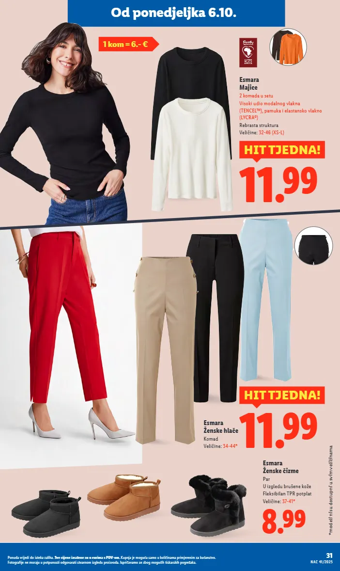 od ponedjeljka 22.9. od ponedjeljka 6.10. esmara majice 2 komada u setu visoki udio modalnog vlakna (tencel™), pamuka i elastansko vlakno (lycra®) rebrasta struktura veličine: 32-46 (xs-l) 11.99 hit tjedna! 8.99 esmara ženske čizme par u izgledu brušene kože fleksibilan tpr potplat veličine: 37-41* *modeli nisu dostupni u svim veličinama esmara ženske hlače komad veličine: 34-44* 11.99 hit tjedna! 31 nac 41/2025 ponuda vrijedi do isteka zaliha. sve cijene izražene su u eurima s pdv-om. kupnja je moguća samo u količinama primjerenim za kućanstvo. fotografije ne moraju u potpunosti odgovarati stvarnom izgledu proizvoda. ispričavamo se zbog mogućih tiskarskih pogrešaka. 1 kom = 6.- €