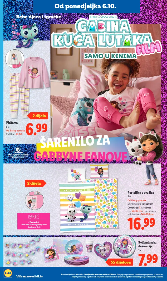 bebe djeca i igračke šarenilo za gabbyne fanove 16.99 posteljina s dva lica set od čistog pamuka s prikrivenim kopčanjem dimenzije: 1 jastučnica cca 60x80 cm i 1 navlaka za pokrivač cca 140x200 cm 7.99 rođendanska dekoracija set 6.99 pidžama set od čistog pamuka veličine: 98-128 2 dijela 2 dijela • klasičan kroj • prikladno za svako godišnje doba • udobno na dodir 55 dijelova samo u kinima samo u kinima od ponedjeljka 6.10. ponuda vrijedi do isteka zaliha. sve cijene izražene su u eurima s pdv-om. kupnja je moguća samo u količinama primjerenim za kućanstvo. fotografije ne moraju u potpunosti odgovarati stvarnom izgledu proizvoda. ispričavamo se zbog mogućih tiskarskih pogrešaka. više na www.lidl.hr