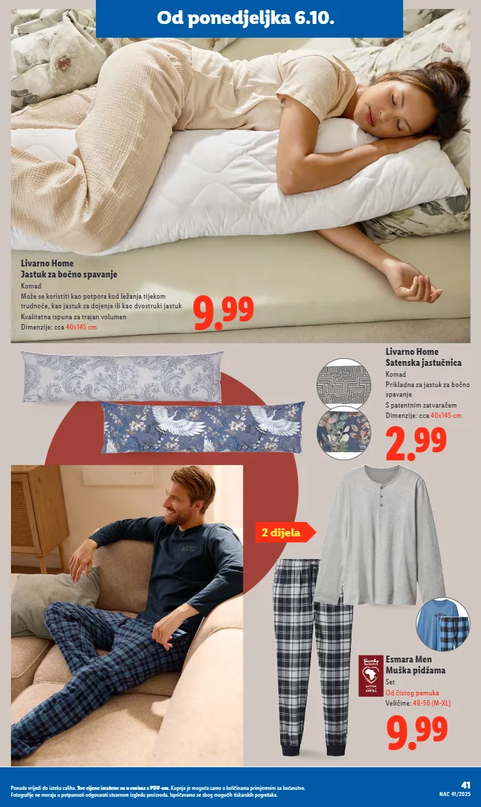 od ponedjeljka 6.10. 2.99 livarno home satenska jastučnica komad prikladna za jastuk za bočno spavanje s patentnim zatvaračem dimenzije: cca 40x145 cm 2 dijela 9.99 livarno home jastuk za bočno spavanje komad može se koristiti kao potpora kod ležanja tijekom trudnoće, kao jastuk za dojenje ili kao dvostruki jastuk kvalitetna ispuna za trajan volumen dimenzije: cca 40x145 cm 9.99 esmara men muška pidžama set od čistog pamuka veličine: 48-58 (m-xl) 41 nac 41/2025 ponuda vrijedi do isteka zaliha. sve cijene izražene su u eurima s pdv-om. kupnja je moguća samo u količinama primjerenim za kućanstvo. fotografije ne moraju u potpunosti odgovarati stvarnom izgledu proizvoda. ispričavamo se zbog mogućih tiskarskih pogrešaka.