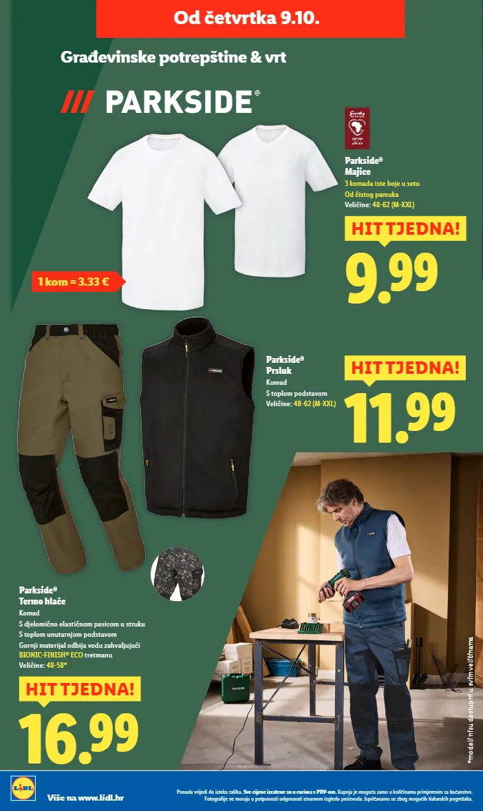 parkside® prsluk komad s toplom podstavom veličine: 48-62 (m-xxl) 11.99 hit tjedna! parkside® termo hlače komad s djelomično elastičnom pasicom u struku s toplom unutarnjom podstavom gornji materijal odbija vodu zahvaljujući bionic-finish® eco tretmanu veličine: 48-58* 16.99 hit tjedna! građevinske potrepštine & vrt od četvrtka 9.10. ponuda vrijedi do isteka zaliha. sve cijene izražene su u eurima s pdv-om. kupnja je moguća samo u količinama primjerenim za kućanstvo. fotografije ne moraju u potpunosti odgovarati stvarnom izgledu proizvoda. ispričavamo se zbog mogućih tiskarskih pogrešaka. više na www.lidl.hr parkside® majice 3 komada iste boje u setu od čistog pamuka veličine: 48-62 (m-xxl) 9.99 hit tjedna! *modeli nisu dostupni u svim veličinama 1 kom = 3.33 €