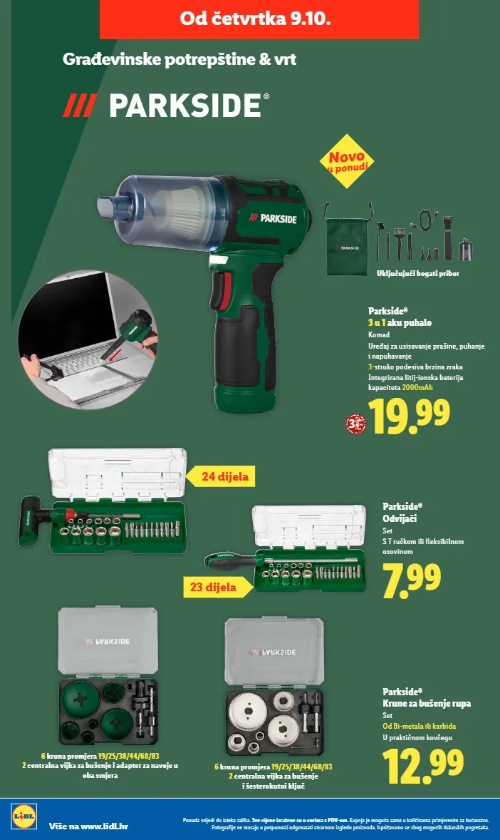 građevinske potrepštine & vrt 19.99 parkside® 3 u 1 aku puhalo komad uređaj za usisavanje prašine, puhanje i napuhavanje 3 -struko podesiva brzina zraka integrirana litij-ionska baterija kapaciteta 2000mah 7.99 parkside® odvijači set s t ručkom ili fleksibilnom osovinom 12.99 parkside® krune za bušenje rupa set od bi-metala ili karbida u praktičnom kovčegu od četvrtka 9.10. ponuda vrijedi do isteka zaliha. sve cijene izražene su u eurima s pdv-om. kupnja je moguća samo u količinama primjerenim za kućanstvo. fotografije ne moraju u potpunosti odgovarati stvarnom izgledu proizvoda. ispričavamo se zbog mogućih tiskarskih pogrešaka. više na www.lidl.hr 6 kruna promjera 19/25/38/44/68/83 2 centralna vijka za bušenje i šesterokutni ključ 6 kruna promjera 19/25/38/44/68/83 2 centralna vijka za bušenje i adapter za navoje u oba smjera uključujući bogati pribor 24 dijela 23 dijela novo u ponudi